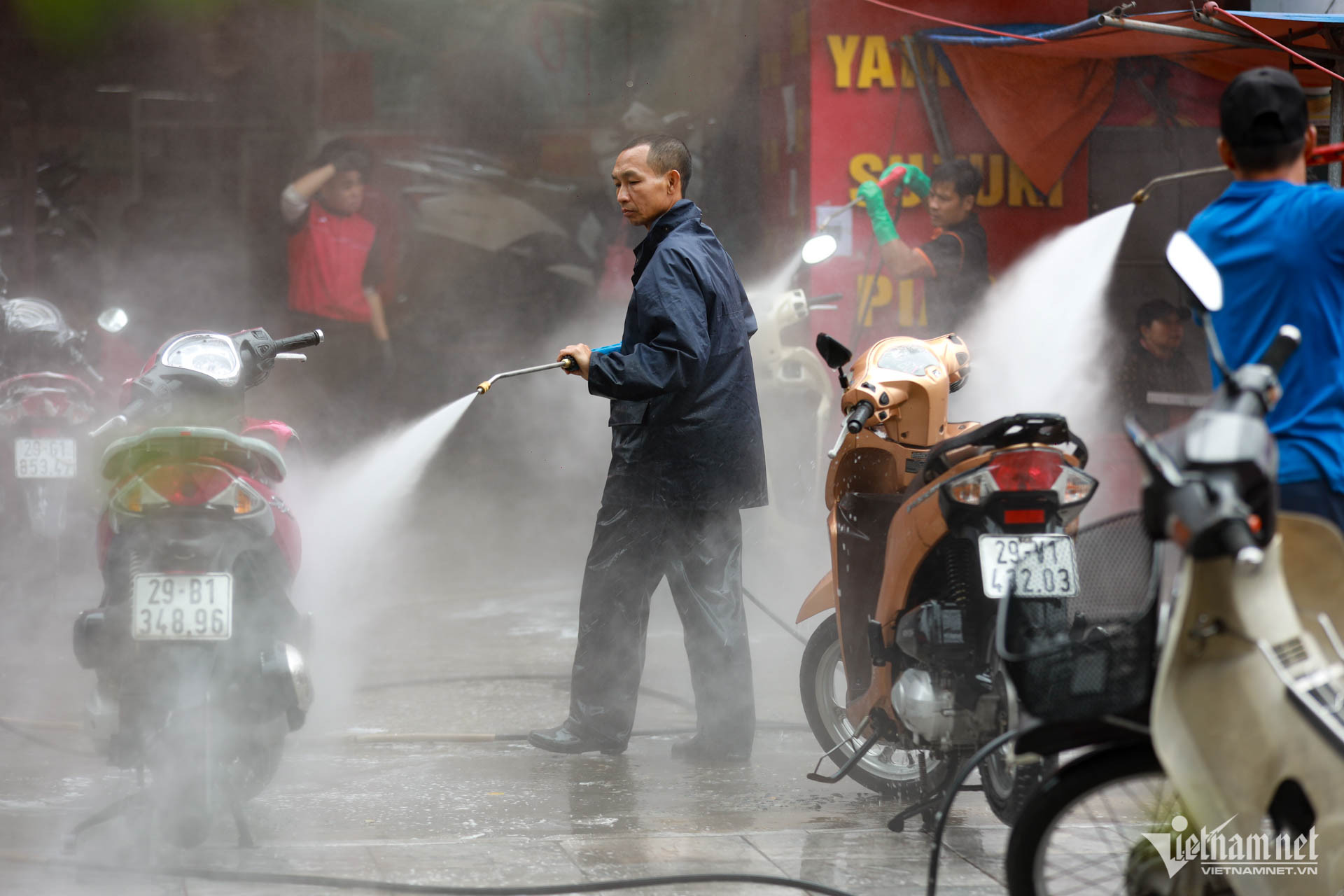 Luôn có hàng chục người đứng chờ rửa xe, chỉ mất khoảng 10 phút một chiếc xe máy được làm sạch và xì khô.