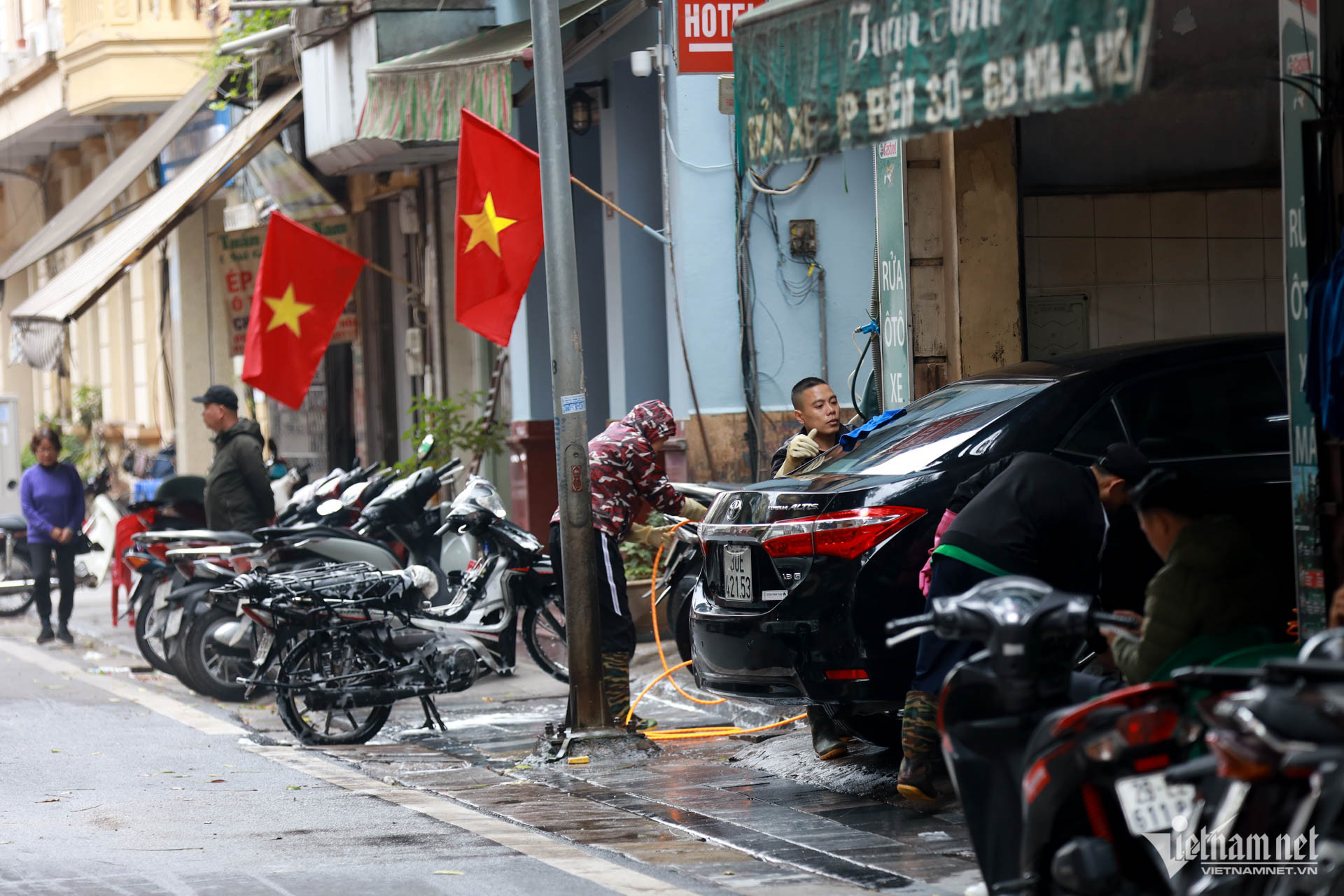 Khung cảnh nhộn nhịp ở các hàng rửa xe trên phố Nhà Hỏa chiều 28 Tết.