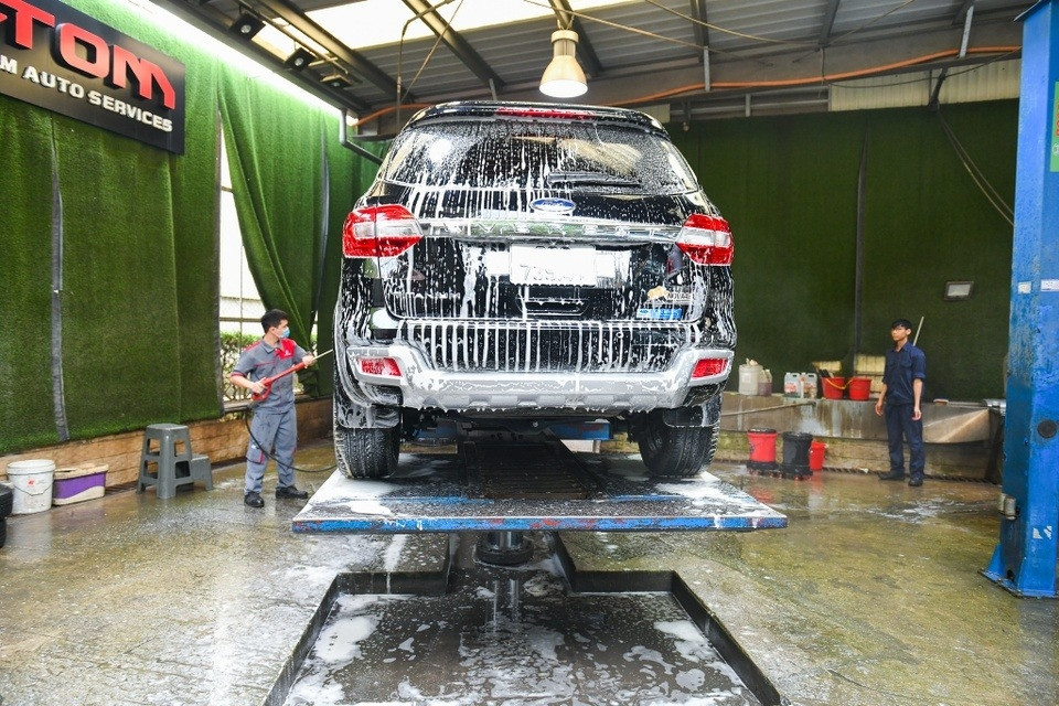 Với 4 chiếc vòi nước áp suất lớn, những chiếc xe nhanh chóng được làm sạch.