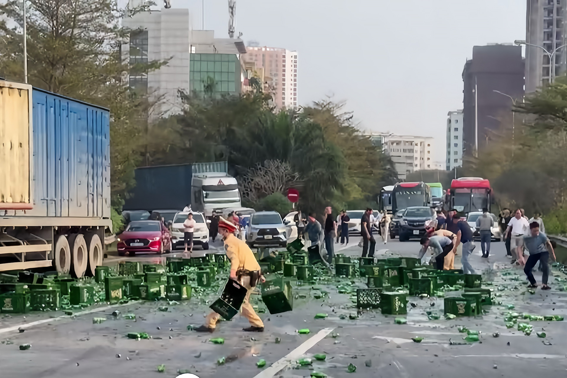 Khi đó, ô tô đầu kéo mang BKS 29LD-314.XX kéo theo container chở bia do anh H.V.B. (SN 1987, ở Con Cuông, Nghệ An) điều khiển, đến khúc cua nhập vào làn cao tốc Pháp Vân - Cầu Giẽ (chiều hướng vào nội thành Hà Nội) thì bị bật chốt cửa xe khiến nhiều thùng bia bị đổ xuống đường.