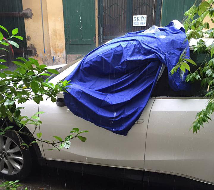 Hiếm có Hà Nội: Che mưa cho ô tô người lạ