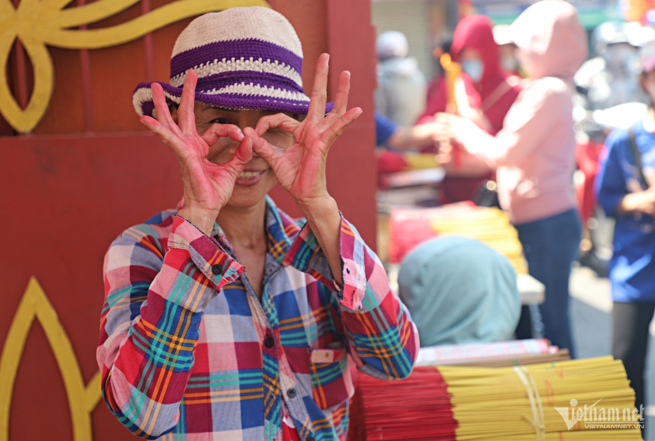 Khách mua, chị tận tình thắp nhang và trò chuyện với họ những câu đùa khiến ai cũng bật ra những tiếng cười sảng khoái. Thậm chí khi có người đưa ống kính máy ảnh về phía mình, chị vui vẻ tạo dáng hài hước, tươi vui.