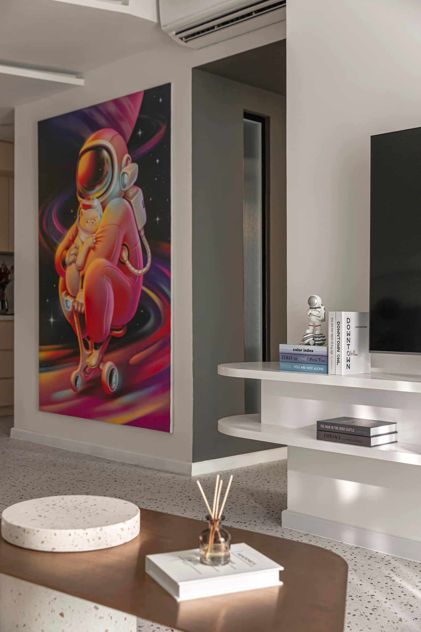 Dù đứng ở bất cứ góc nào, đều nhìn thấy bức tranh này. Màu sắc nóng, nổi bật trên nền trắng, thể hiện gu thẩm mỹ cao của gia chủ. "Đây là 1 bức vẽ trên máy do họa sĩ vẽ riêng cho tôi. Sau khi vẽ xong, tôi in ra canvas rồi treo lên", anh Tín Dương nói.