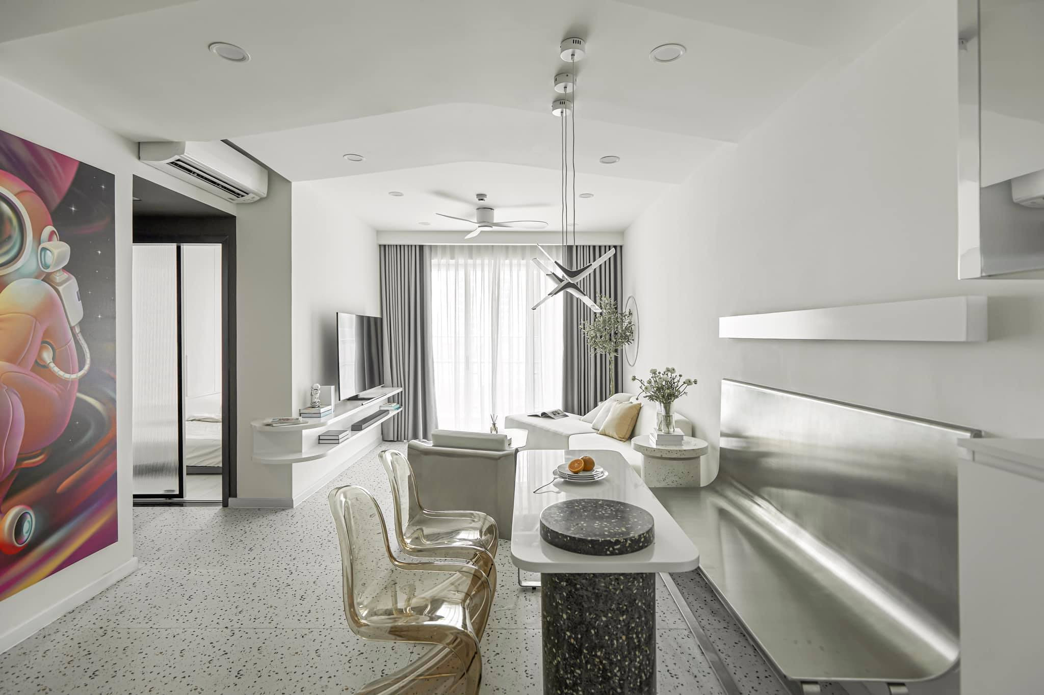Khu phòng khách giống như khoang phi thuyền, bàn trà chất liệu bằng hợp kim. Sàn lát bằng đá terrazo, làm theo yêu cầu gia chủ, giá dao động từ 500 - 600 nghìn đồng/m2.