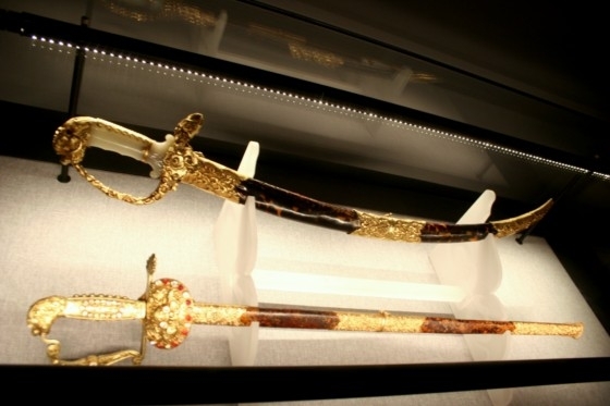 | Đôi kiếm vàng triều Nguyễn đúc vào thế kỷ XIX, nặng 1,25kg tượng trưng cho quyền lực của vua |
