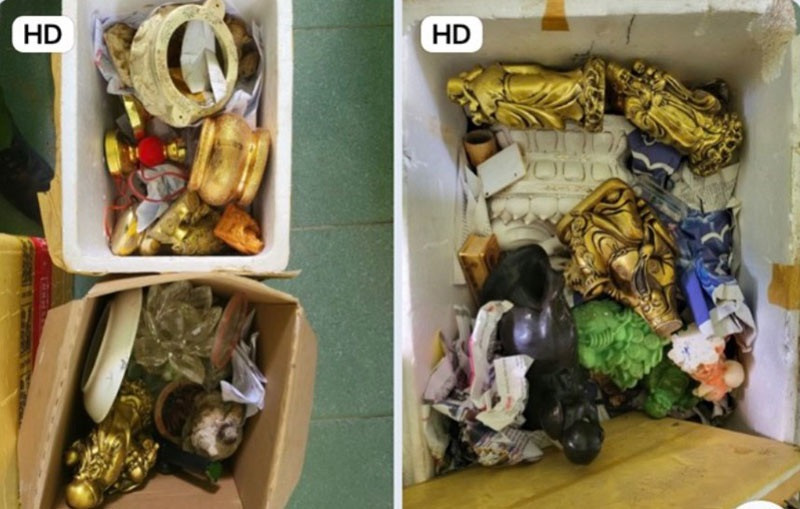 Các đồ vật tìm thấy tại nhà trọ của 2 cha con có nhiều tượng tỳ hưu và thần tài, giống với những đồ vật ở hiện trường (Ảnh: L.A).
