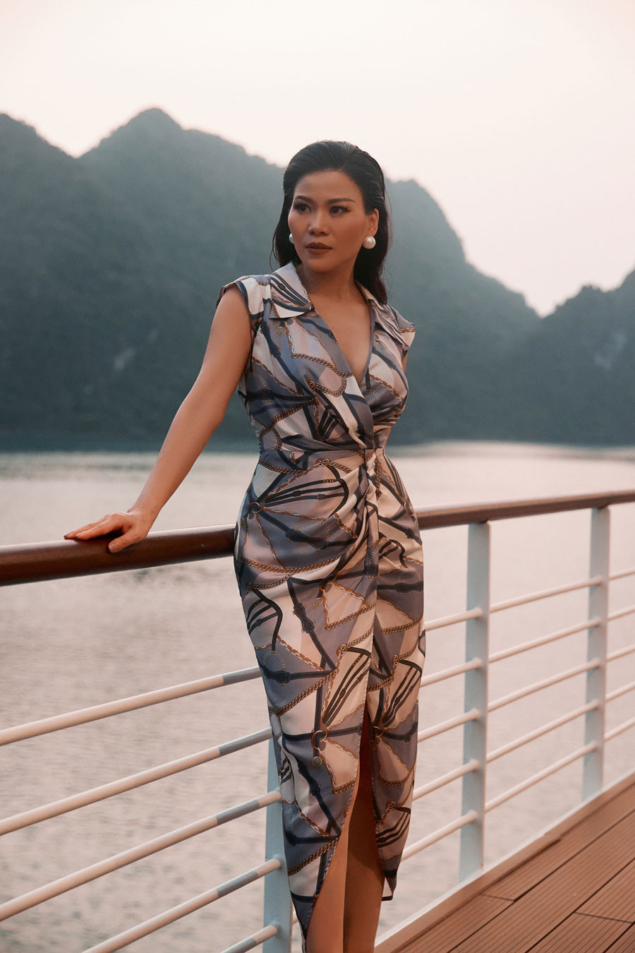 Trong bộ ảnh mới, NTK Helene Hoài tận hưởng chuyến du ngoạn trên du thuyền 5 sao. Ở tuổi 45, chị vẫn có nhan sắc trẻ trung, thân hình quyến rũ cùng phong thái thu hút trước ống kính. Diện những mẫu áo váy màu sắc nổi bật, Helene Hoài làm bật lên nét sang trọng, tự tin.