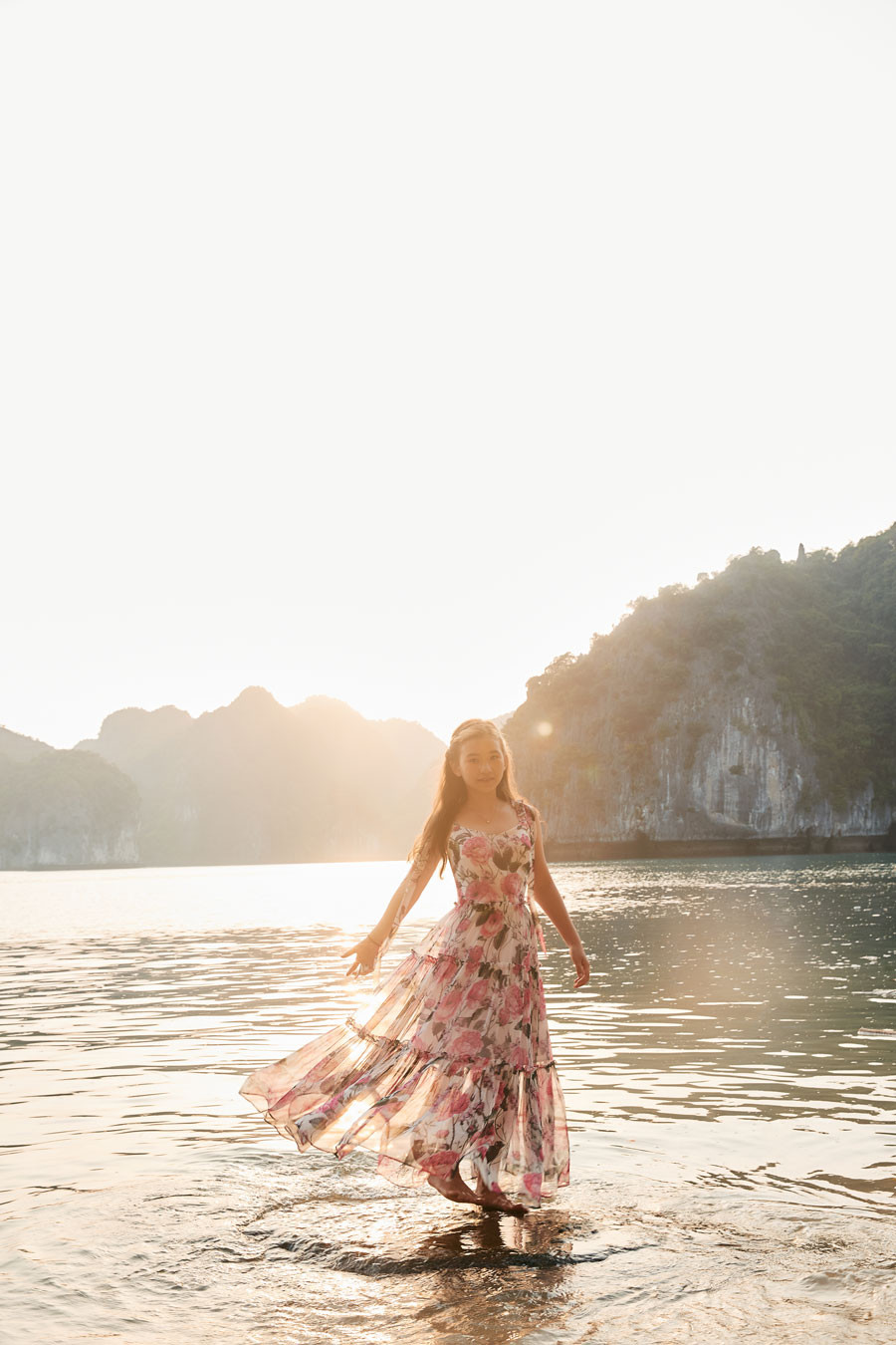 Hai mẹ con Helene Hoài cùng diện mẫu đầm maxi họa tiết hoa hồng trẻ trung, màu sắc ngọt ngào với chất liệu chiffon đón gió. Thiết kế phù hợp nhiều độ tuổi, là gợi ý lý tưởng để có những bức hình lãng mạn cùng biển xanh, nắng vàng.