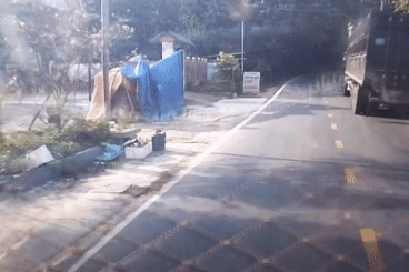 Quá bất ngờ và đang đi với tốc độ cao, tài xế chiếc xe con đã phải đánh lái lên cả vệ cỏ để tránh tông phải xe thùng kéo nói trên rồi nhanh chóng trở lại đường. Hai chiếc xe chỉ cách nhau một vài cm và may mắn không va chạm với nhau.