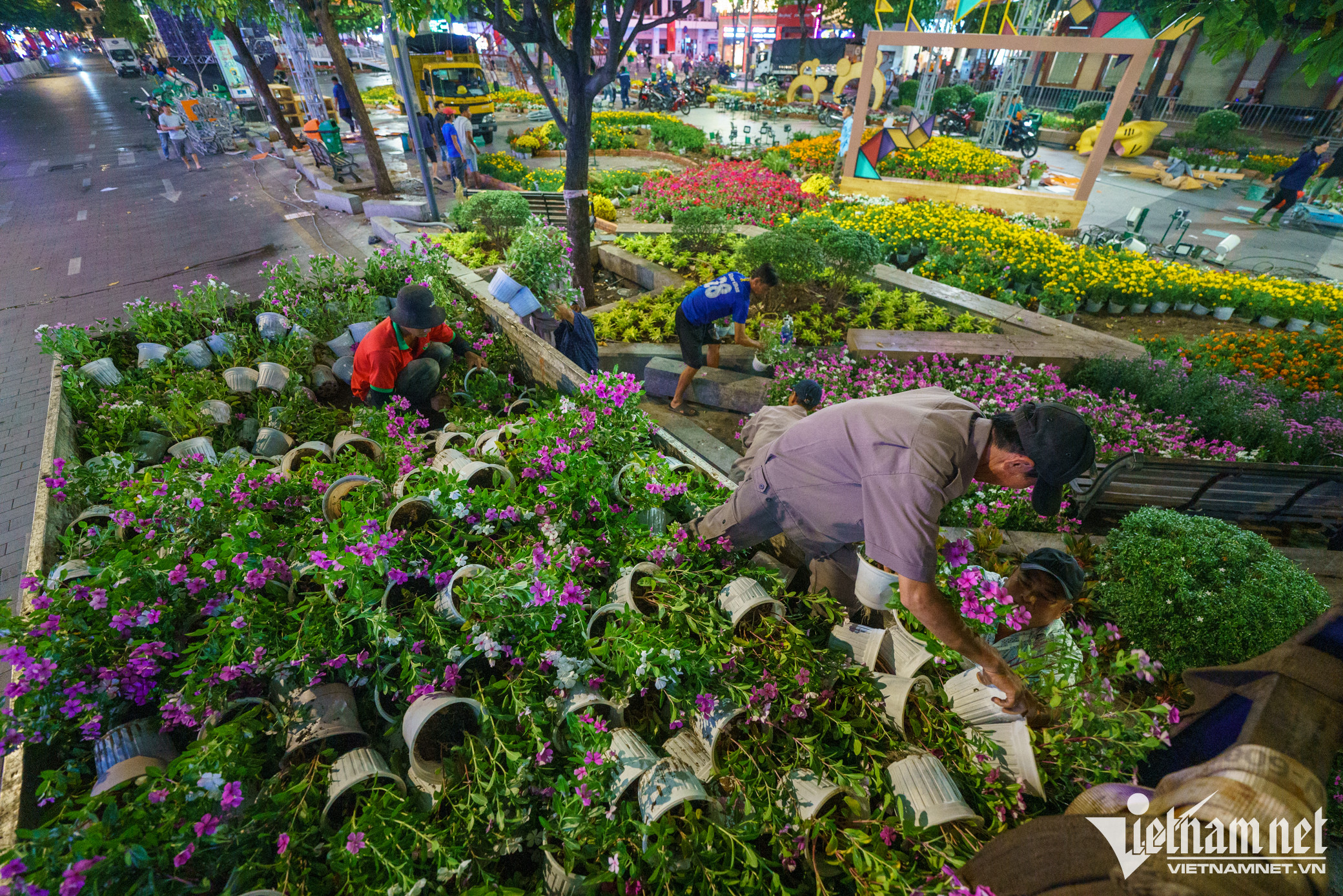 Công nhân di dời từng chậu hoa lên xe tải, đưa đến các công viên trung tâm TP HCM như 30/4, 23/9... để tiếp tục trang trí. Năm nay, đường hoa Nguyễn Huệ sử dụng khoảng 88 giống hoa, 18 loại lá, gần 106.000 chậu, giỏ hoa các loại và hơn 300m2 cỏ.