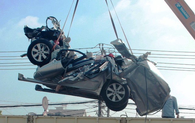 Chiếc xe du lịch chở gia đình đang dừng đèn đỏ tại ngã tư thì bất ngờ gặp tai nạn.