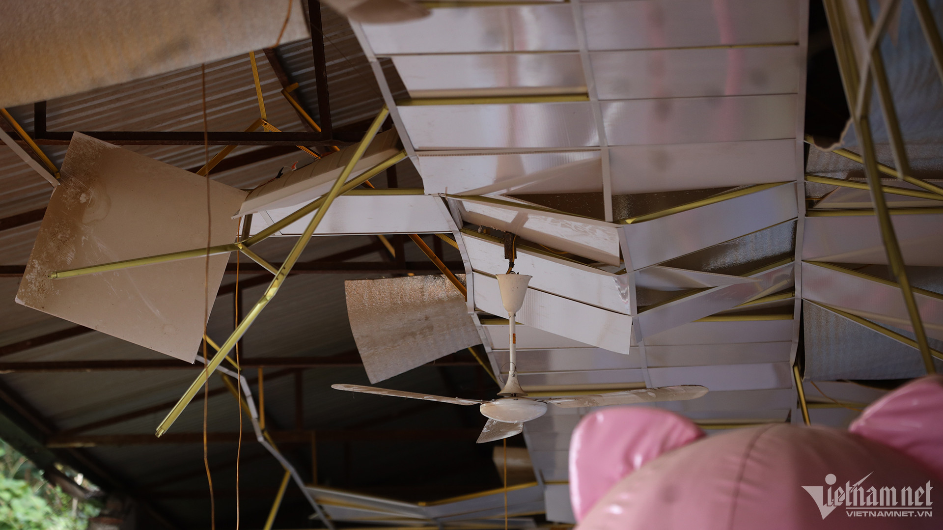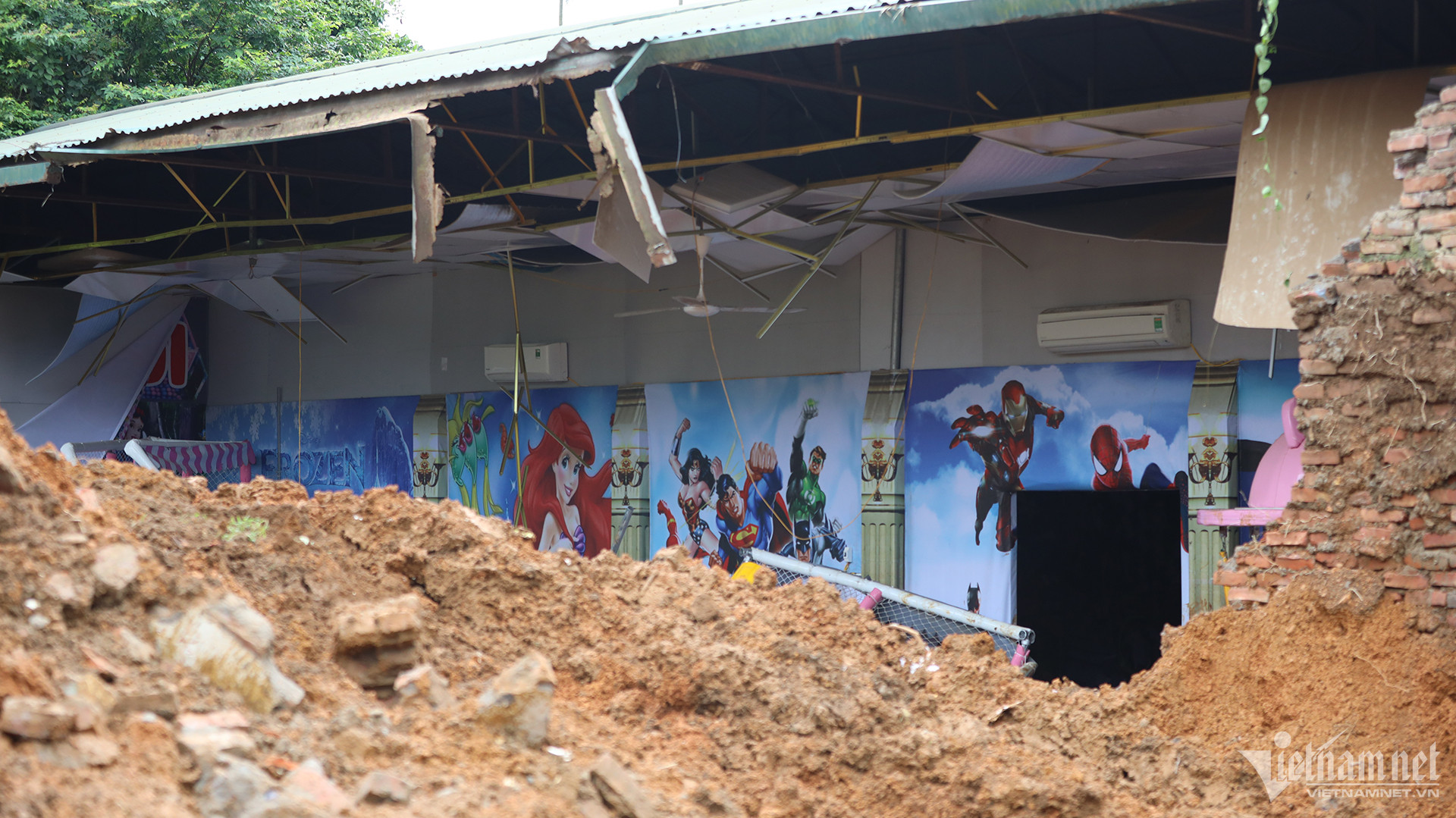 Tường và đất đá sau đó xô vào nhà bóng, đu quay... bên trong khu vui chơi, các vật dụng bị hư hỏng, đổ nát.