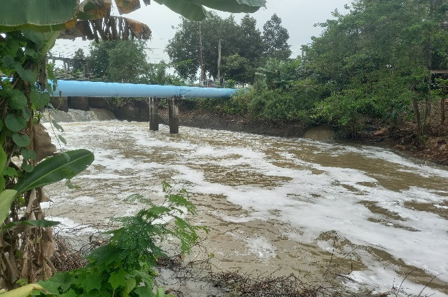 Dưới dòng sông bọt trắng trôi nổi theo từng đám, có mùi hôi khó chịu. Trước đó, lúc 9h cùng ngày khi người dân phản ánh, lượng bọt trắng bao phủ cả dòng sông, lớp bọt cao bao phủ hoàn toàn làm cho dòng sông biến thành màu trắng.