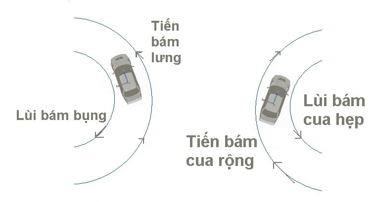 Ngược lại, khi lùi cần bám sát vào đường cong hẹp để tạo cho phần đầu xe góc lùi lớn hơn, bánh trước không bị chèn ra ngoài. Việc tiến bám lưng còn giúp chúng ta khi lái xe ở những đoạn đường cong, đèo dốc không bị đè vạch, nhất là đối với những chiếc xe dài.