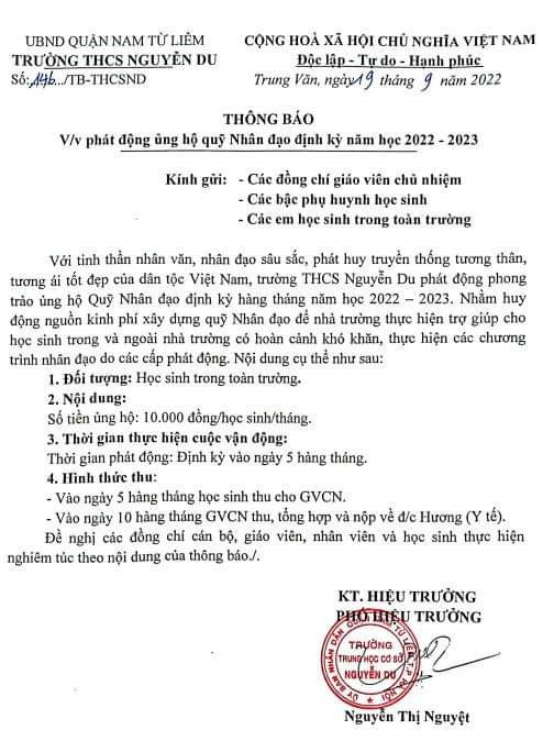 Mới đây, Trường THCS Nguyễn Du (quận Nam Từ Liêm, Hà Nội) đã có thông báo phát động ủng hộ Quỹ nhân đạo định kỳ năm học 2022-2023, gửi tới các giáo viên chủ nhiệm, phụ huynh và học sinh toàn trường.