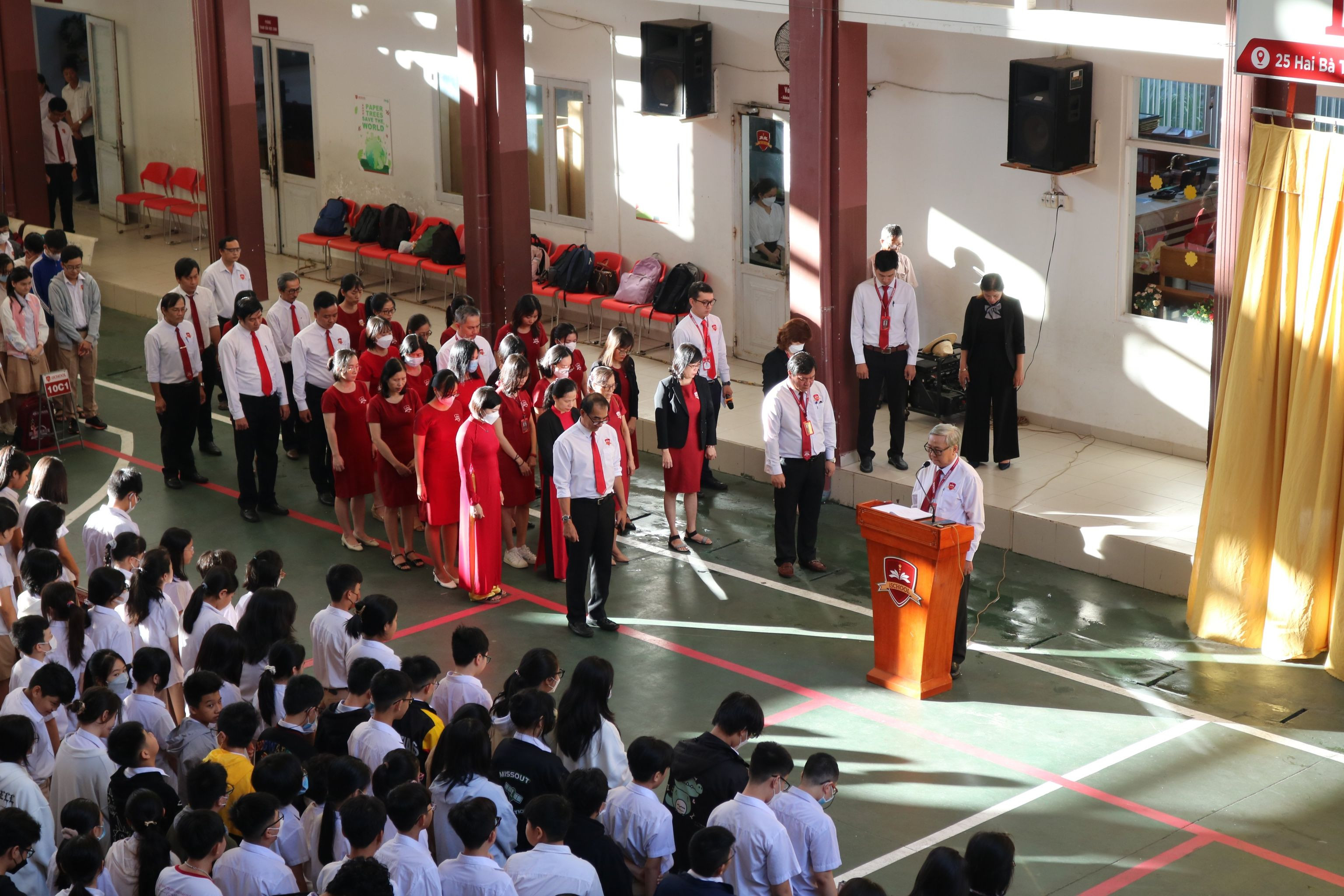 Sau lễ chào cờ, tập thể thầy cô và học sinh nhà trường dành một phút mặc niệm, tưởng nhớ tới nam sinh lớp 1 đã qua đời trong vụ ngộ độc.