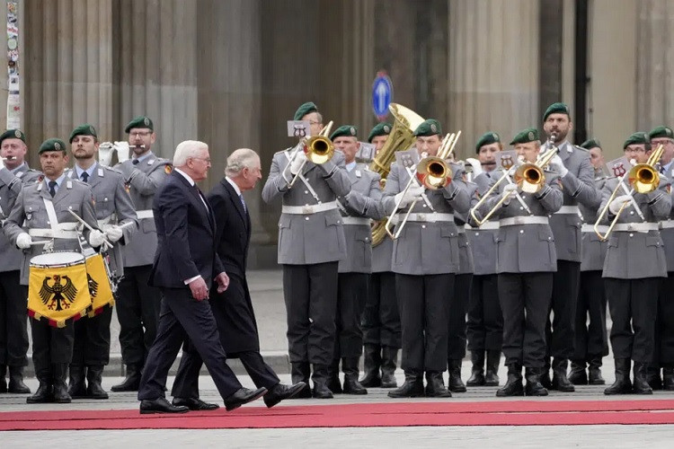 Hãng thông tấn CNN cho hay, Vua Charles III và Hoàng hậu Camilla của Anh hôm 29/3 đã tới thành phố Berlin, và được Tổng thống Đức Frank-Walter Steinmeier cùng Đệ nhất phu nhân Elke Budenbender chào đón với nghi thức quân đội tại Cổng Brandenburg.