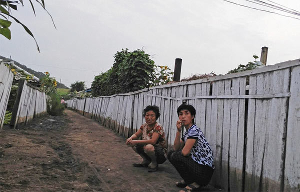 Hai phụ nữ ngồi nghỉ giải lao trên một lối đi ở Tumangang. (Ảnh: Getty) |