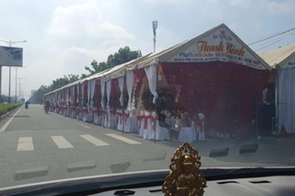 Trước đó, từ sáng cùng ngày trên mạng xã hội xuất hiện hình ảnh một rạp đám cưới nằm giữa đường, dài hơn 10m lấn hết một làn đường lưu thông.