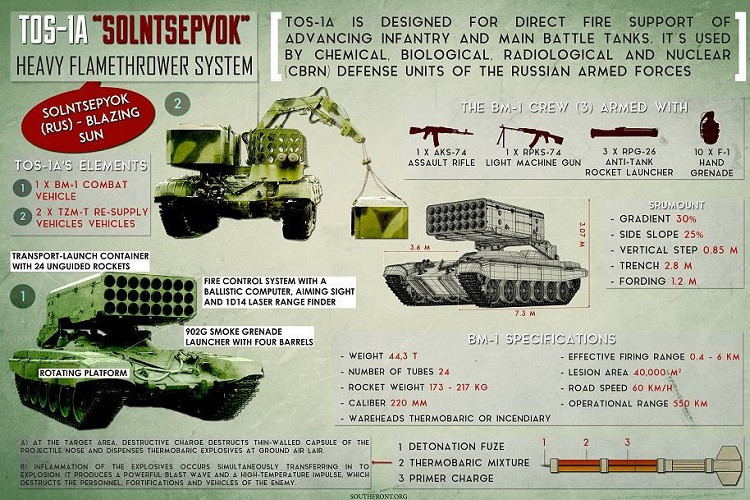 TOS-1A sử dụng tên lửa nhiệt áp có đường kính 220mm. Khi tên lửa này phát nổ, khối chất hóa học gây cháy nặng 45kg ở phần đầu tên lửa sẽ được bung ra trong một phạm vi giới hạn. Những chất hóa học sau đó sẽ đốt cháy trong chớp mắt toàn bộ khí ôxy trong không gian hẹp với nhiệt độ lên tới 1.000°C, đủ để tiêu diệt bộ binh đối phương đang trú ẩn trong các công sự, hầm ngầm hoặc hang động.
