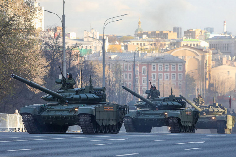 Các đơn vị vũ trang diễu hành theo đội hình và các xe tăng, hệ thống pháo tự hành nối đuôi nhau trình làng.
