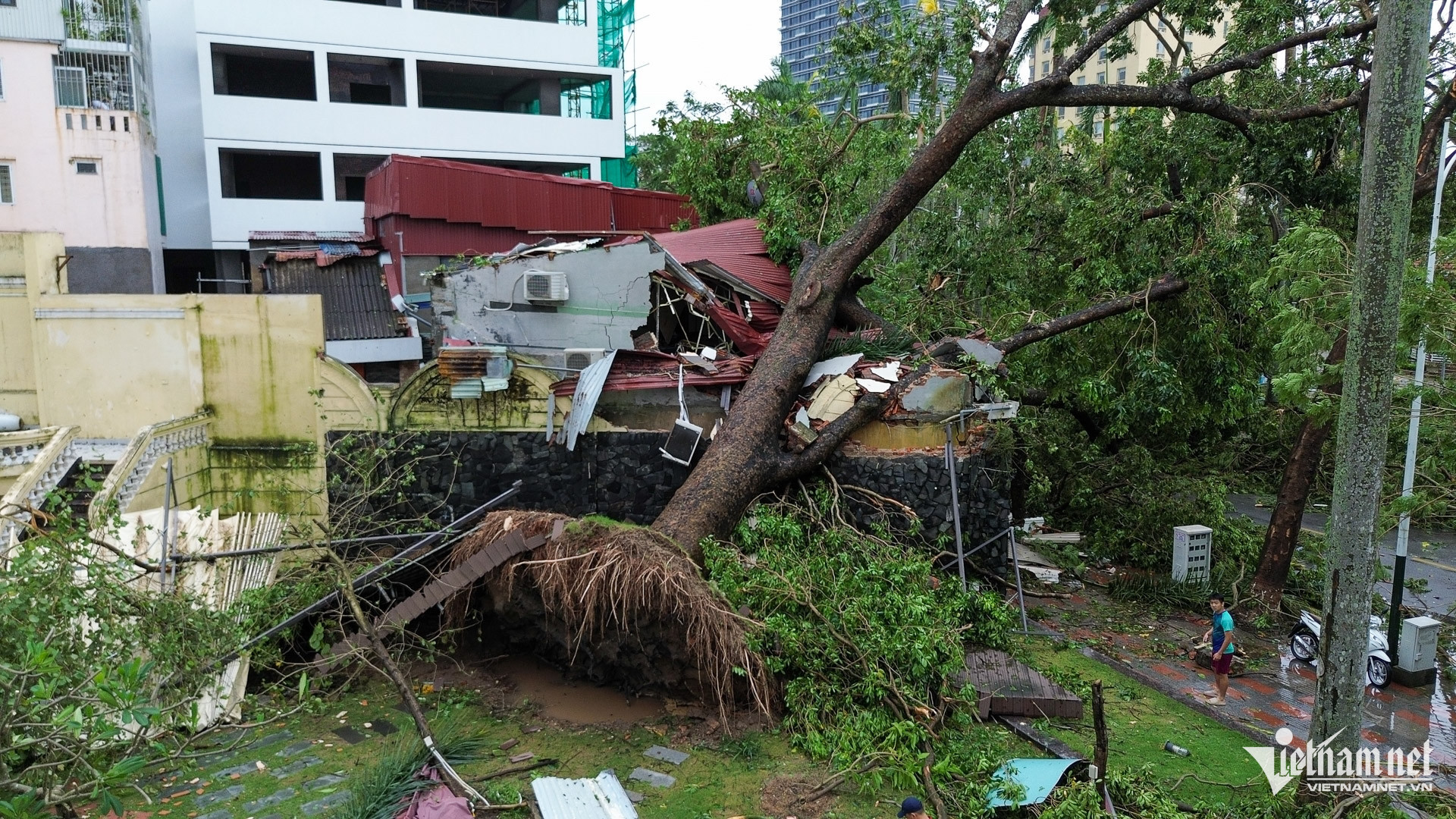 Hải Phòng, thành phố lân cận Quảng Ninh cũng chịu thiệt hại không kém. Cảnh tan hoang ở khắp nơi sáng 8/9. Trong ảnh, ngôi nhà 2 tầng số 6 Trần Hưng Đạo của bà Vinh đã cho thuê bán cà phê. Đêm 7/9, cây đổ vào khiến nhà bị hư hỏng hoàn toàn. May mắn không có thiệt hại về người. Ảnh: Phạm Hải.