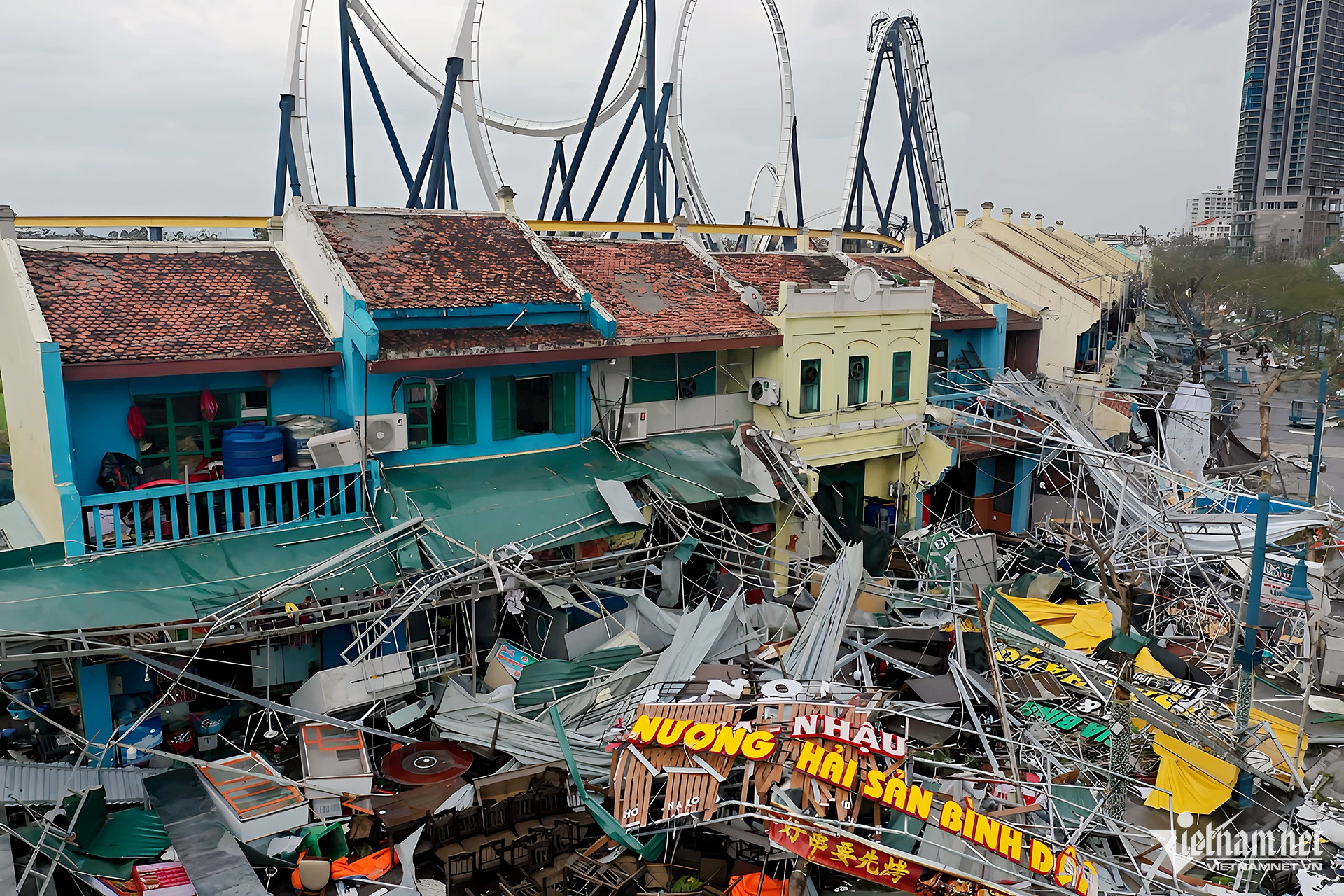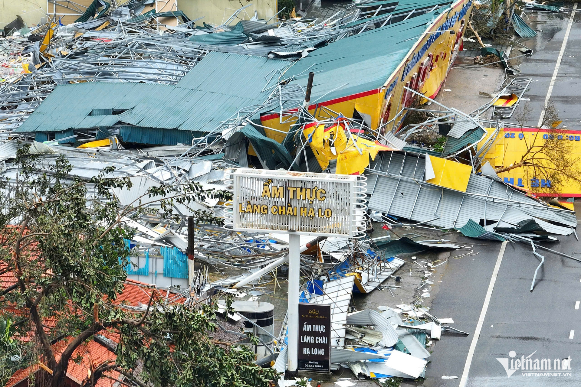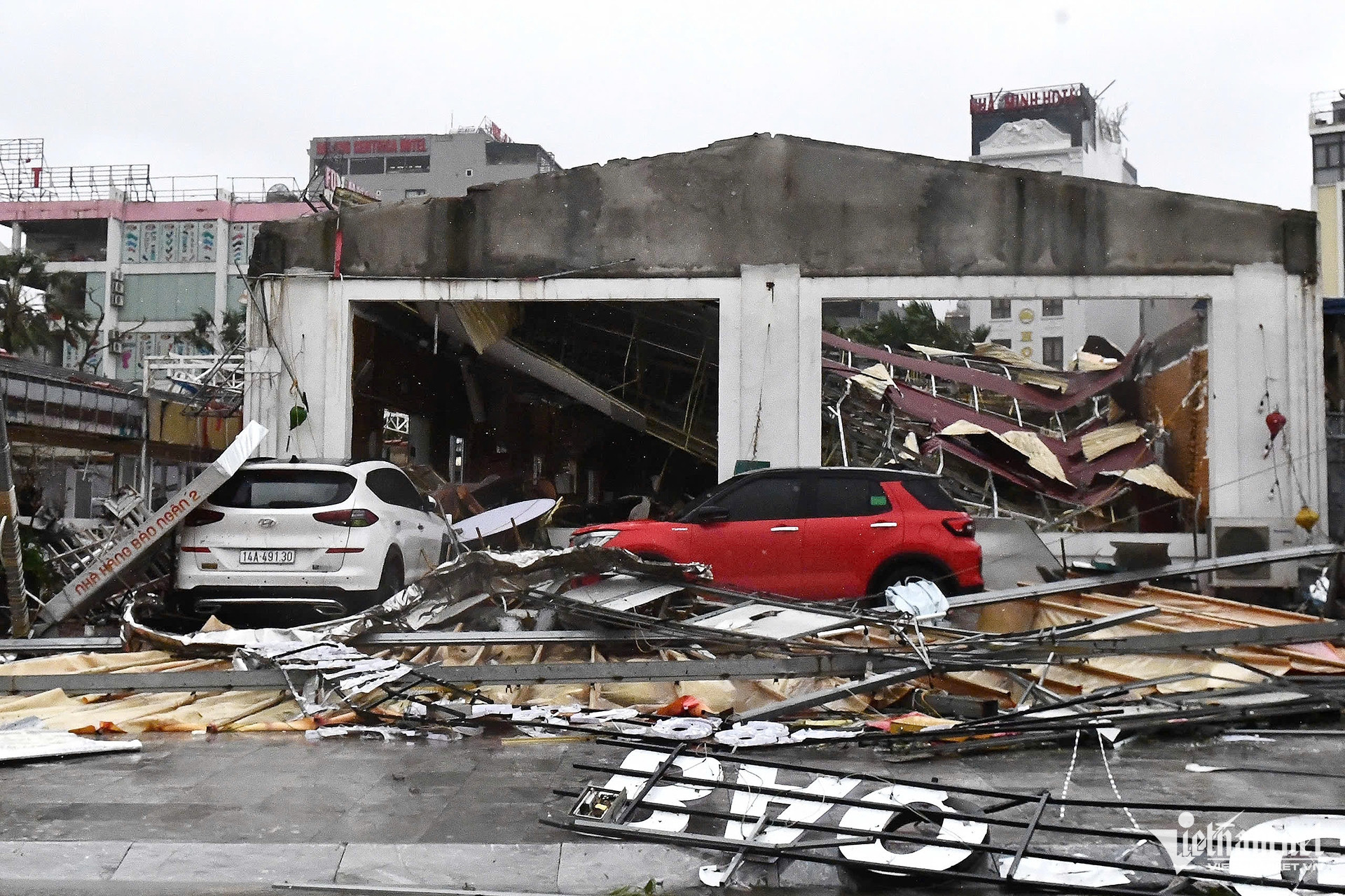 Ngay sau đó là một khung cảnh tan hoang. Hàng loạt nhà dân, mặt bằng cho thuê chịu thiệt hại nặng nề. Trong ảnh, dãy nhà hàng kinh doanh hải sản ở Bãi Cháy bị sập mái, tốc cửa. Những ô tô đỗ trên vỉa hè cũng bị ảnh hưởng khi nhiều vật dụng rơi vào. Ảnh: Thạch Thảo.