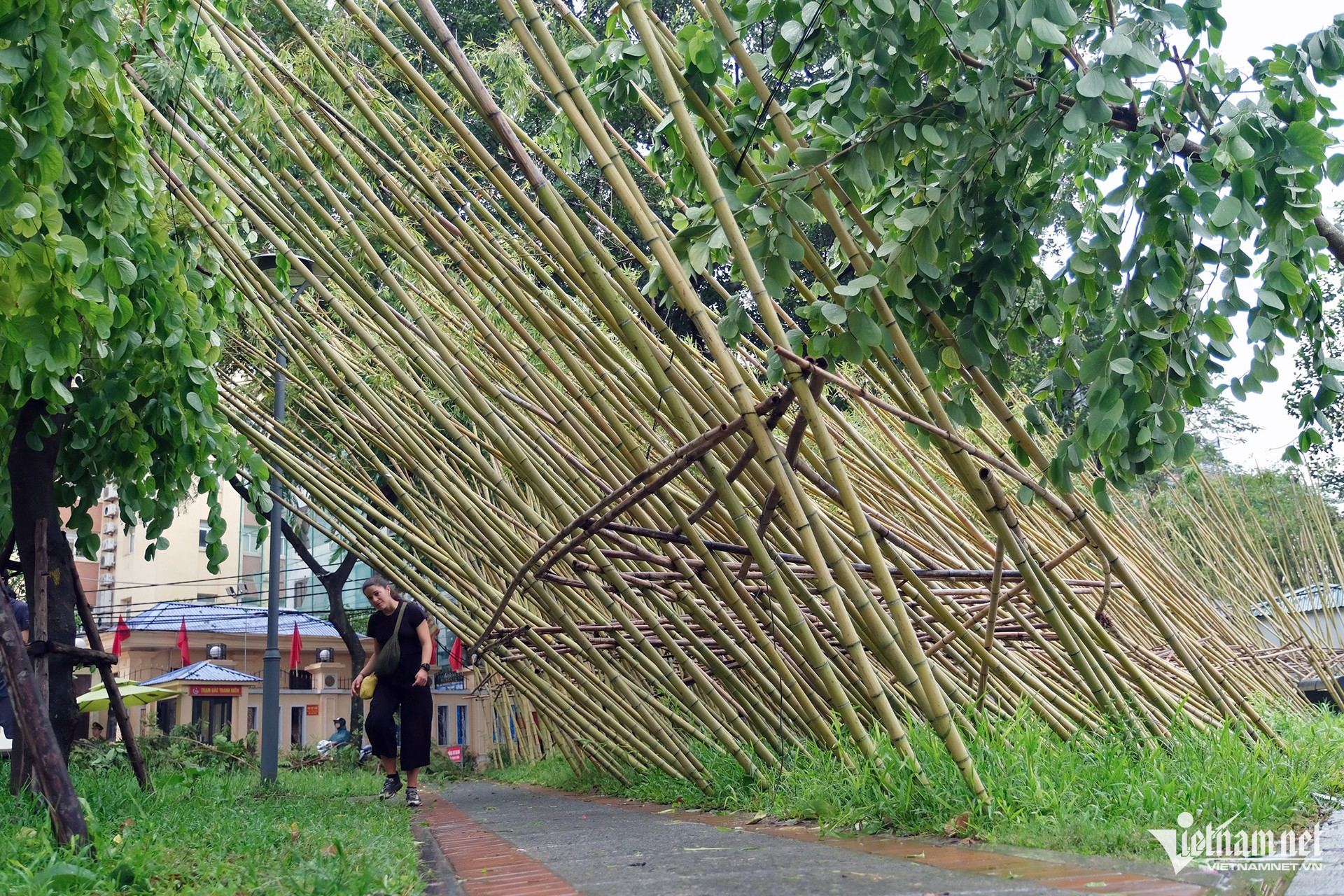 Rừng trúc xanh trồng bên hồ Trúc Bạch để thu hút khách du lịch cũng bị gió quật nghiêng ngả. Nhiều cây bật gốc. Ảnh: Hùng Nguyễn.