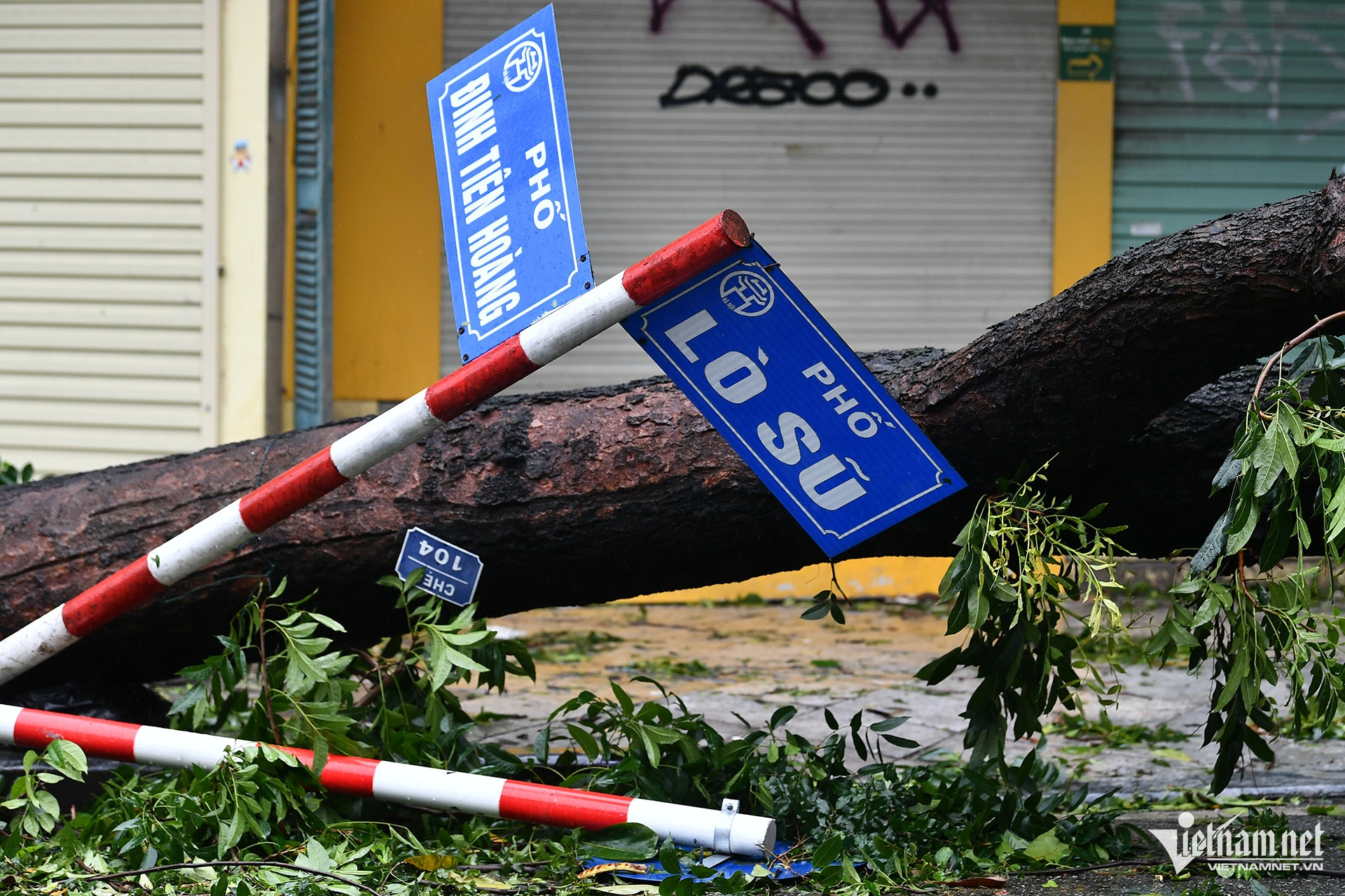 Gần như không có tuyến phố nào không có cây xanh bị đổ. Đến gần trưa cùng ngày, Ban Chỉ huy phòng chống thiên tai và tìm kiếm cứu nạn TP Hà Nội cho biết, bão số 3 đi qua đã làm gãy đổ hơn 14.600 cây xanh trên địa bàn. Ảnh: Hùng Nguyễn.