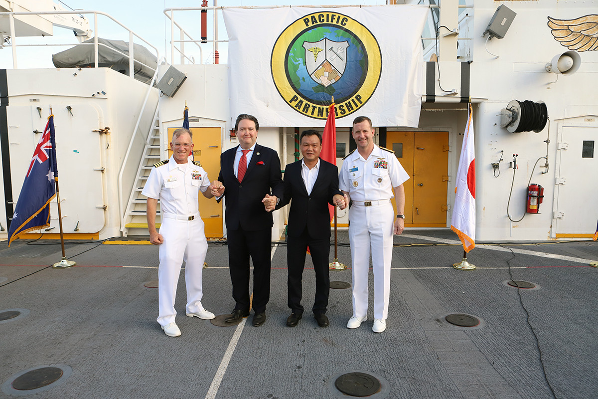 Tàu bệnh viện của Hải quân Mỹ USNS Mercy (T-AH-19) neo tại Vũng Rô để cùng tham gia các hoạt động của PP22. Chương trình Đối tác Thái Bình Dương năm 2022 (PP22) ngày hôm qua đã kết thúc sau gần hai tuần diễn ra tại Phú Yên. Trong thời gian này, tàu bệnh viện của Hải quân Mỹ USNS Mercy (T-AH-19) neo tại Vũng Rô để cùng tham gia các hoạt động.Sau lễ bế mạc, đoàn PP22 tổ chức, mời các chính quyền Phú Yên cùng tham quan tàu USNS Mercy. Tàu có sức chứa 1.000 giường bệnh. Lối dẫn lên tàu được làm nghiêng, điều này thuận lợi cho việc di chuyển bệnh nhân. Tại nhiều khu vực được gắn băng ca phục vụ y tế.Trong một phòng rộng được bố trí nhiều giường bệnh. Tất các các bệnh nhân khi lên đây sẽ đưa vào một phòng rộng để tập trung cho việc thăm khám, sau đó chuyển đến các phòng chức năng, tùy vào tình trạng bệnh.Tàu Mercy được đánh giá là một trong những bệnh viện lớn nhất của Hải quân Mỹ khi có thể tới 1.200 nhân viên y tế và 71 thủy thủ. Bên trong được trang bị nhiều thiết bị y tế hiện đại, với sứ mệnh là cung cấp các dịch vụ hỗ trợ y tế nhanh chóng, linh hoạt trong mọi tình huống xảy ra thảm họa, cứu trợ đạo…Quân y trên tàu đang giới thiệu về mô hình nội soi được trang bị để dành cho các đợt trao đổi về y tế khi tham gia hoạt động PP22. Trong đó, có các bác sĩ của Bệnh viện Đa khoa tỉnh Phú Yên từng dự trong hoạt động lần này. Một chiến sĩ Hải quân Mỹ giới thiệu về máy chụp cắt lớp CT. Cùng với đó, tàu còn có 4 buồng chụp X-quang, 12 phòng phẫu thuật, khu cách ly… cùng nhiều khu vực khác phục vụ bệnh nhân trong mọi tình huống.Tàu Mercy có 80 giường chăm sóc tích cực dành cho bệnh nhân. Cạnh đó ngân hàng máu sống được xây dựng nhiều năm qua để dự trữ cần thiết và phát huy tác dụng trong nhiều trường hợp cấp cứu. Nhờ vào nhân lực y tế luôn túc trực, cùng nhiều thiết bị y tế hiện đại, tiên tiến, trên tàu có khả năng thực hiện các ca phẫu thuật về tim, chỉnh hình, lồng ngực, thần kinh, tim mạch…Dọc hành lang các tầng được trưng bày hình ảnh về các hoạt động đã diễn ra. Một thủy thủ đoàn giới thiệu các chương trình mà họ đã tham dự, được ghi lại bằng hình ảnh để trưng bày. Trên tàu có nhiều xuồng phục vụ công tác huấn luyện cứu hộ, cứu nạn trên biển. Tàu cũng có không gian riêng với nhiều dụng cụ thể dục thể thao như đạp xe, máy chạy bộ…, giúp các chiến sĩ hải quân vận động thể lực. Phía boong sau tàu Mercy là sân đỗ trực thăng, phục vụ cho các tình huống cấp cứu khẩn cấp và là nơi để diễn ra các sự kiện cũng như hoạt động khác. Tàu này đưa vào hoạt động từ năm 1986, có trọng tải hơn 69.000 tấn, dài 272 m, rộng 32 m, tốc độ 17,5 hải lý/h.Chương trình Đối tác Thái Bình Dương 2022 với sự tham gia khoảng 700 người đến từ nhiều quốc gia cùng tàu bệnh viện USNS Mercy diễn ra tại Phú Yên, từ ngày 19/6 đến 3/7, do Mỹ dẫn đầu. Trong ảnh: ông Đào Mỹ, Phó Chủ tịch UBND Phú Yên (thứ ba từ bên trái qua) chụp ảnh lưu niệm cùng đoàn PP22 cùng đại sứ Hoa Kỳ tại Việt Nam.