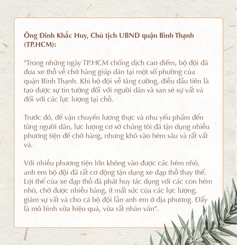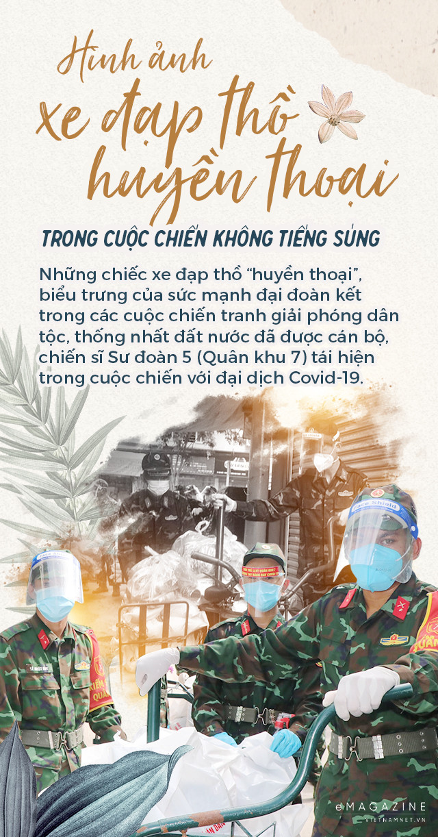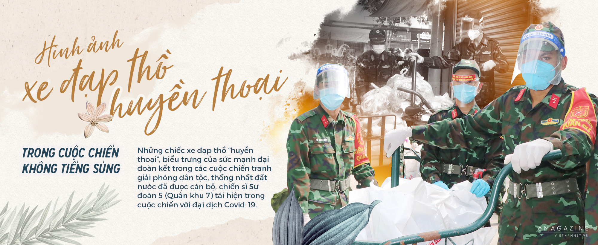 Trong đợt tăng cường đó, những chiếc xe đạp thồ của Điện Biên Phủ năm xưa đã được chiến sĩ Sư 5 tái hiện lại trong việc chở nhu yếu phẩm vào những hẻm nhỏ, hẻm sâu trên địa bàn TP.HCM để trao tận tay người dân.