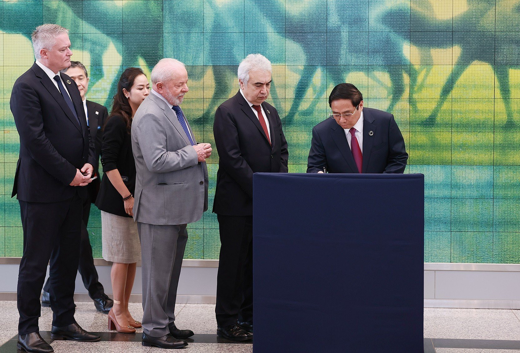 Thủ tướng Phạm Minh Chính cùng các trưởng đoàn ký sổ lưu niệm. Sau đó, các trưởng đoàn đến khu vực đài tưởng niệm Hòa bình và đặt vòng hoa tại bia tưởng niệm các nạn nhân vụ đánh bom nguyên tử.