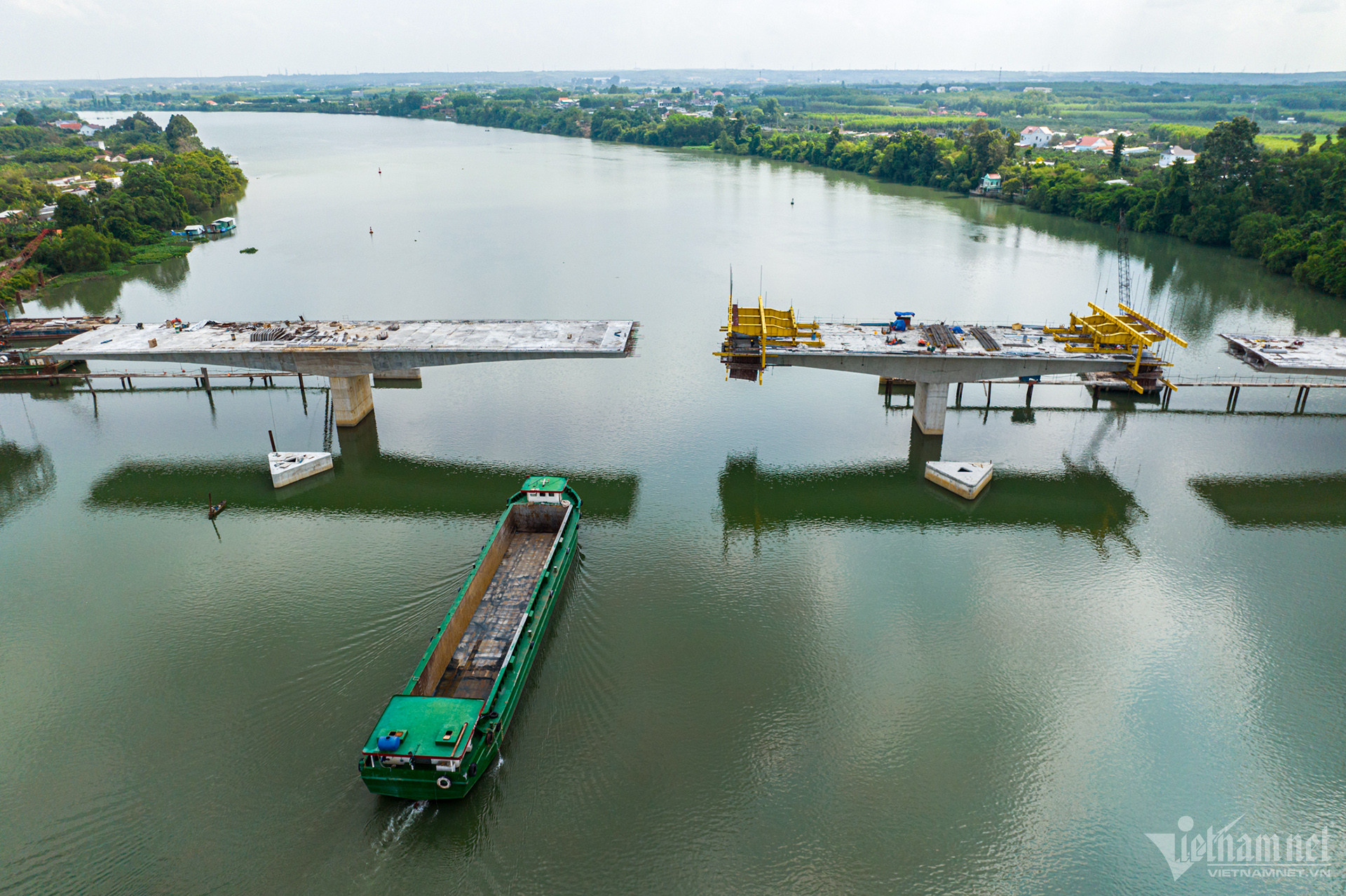 Thời điểm này, giữa tháng 5, công nhân đang thi công các đốt đúc hẫng cân bằng, bệ thân mố M1. Khối lượng công trình ngoài sông đạt khoảng 70% so với hợp đồng.