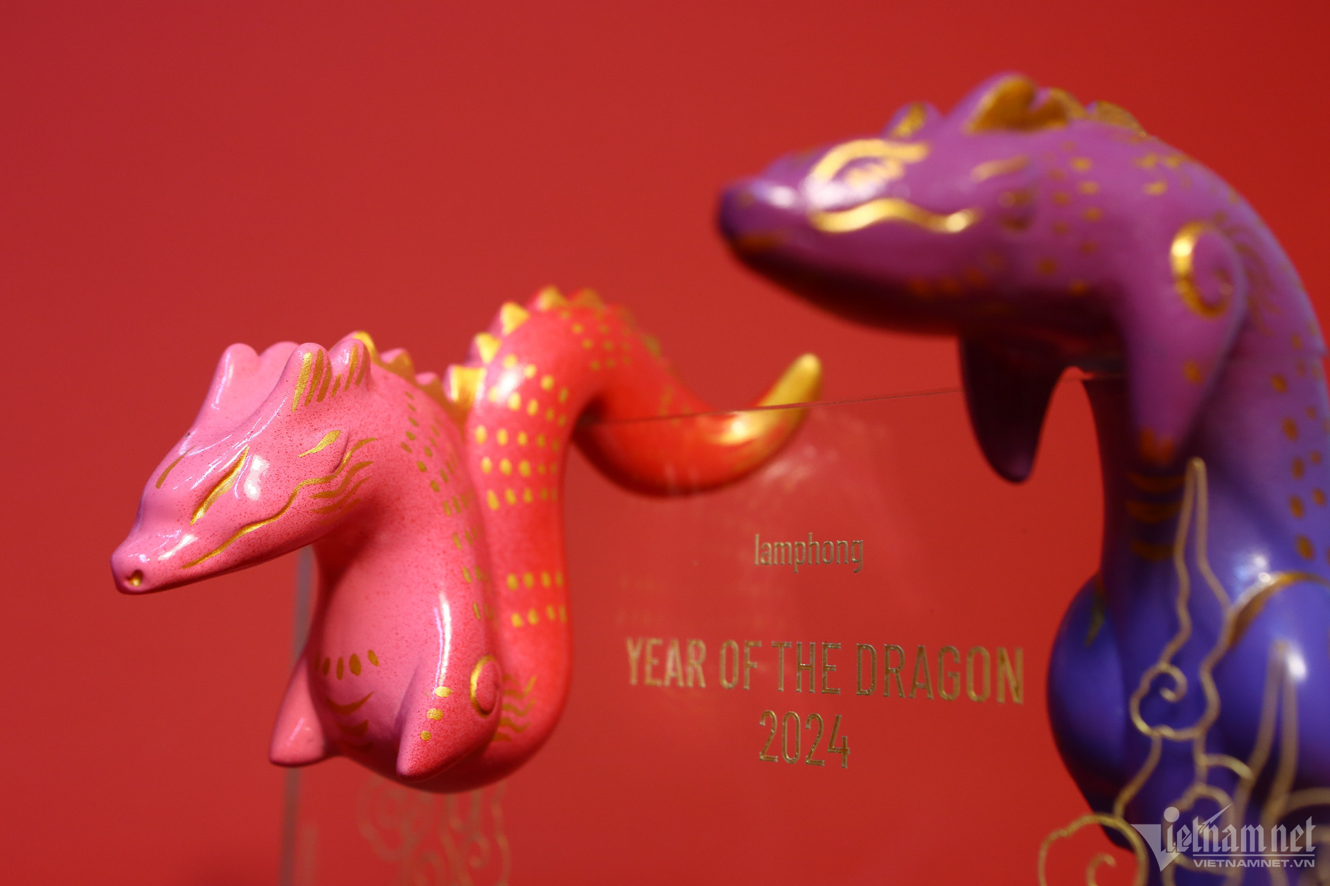 Rồng làm bằng bột đá ép kết hợp giữa bảng màu hiện đại của sơn phun và những nét vẽ tay sử dụng chất liệu sơn mài truyền thống.