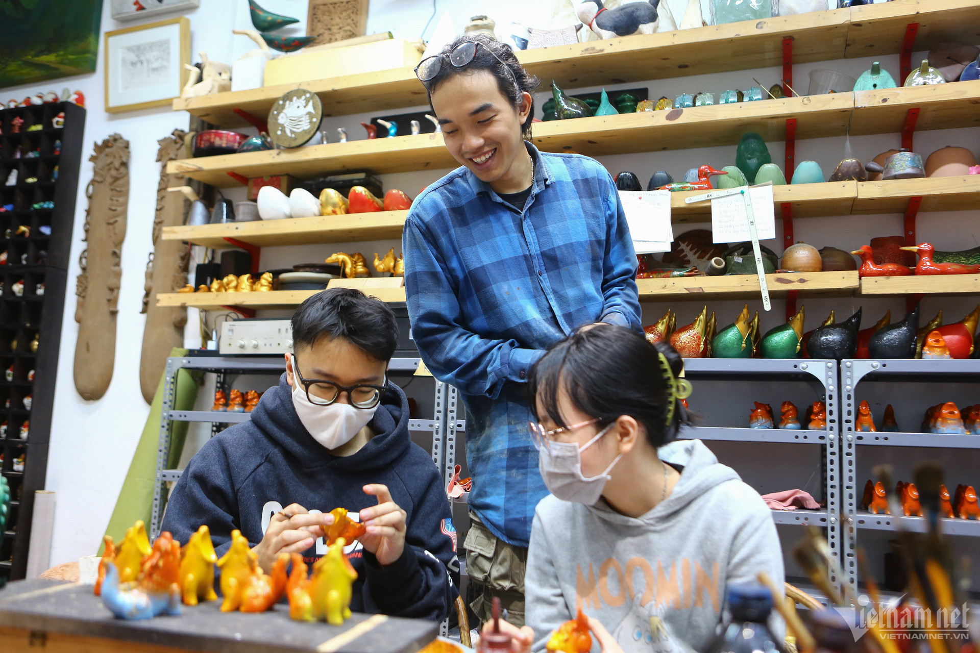 Các sản phẩm đều được làm hoàn toàn thủ công. Studio hiện tại có khoảng 8-10 họa sĩ và các bạn cộng tác viên là sinh viên ngành mỹ thuật thay ca làm việc liên tục tại xưởng.