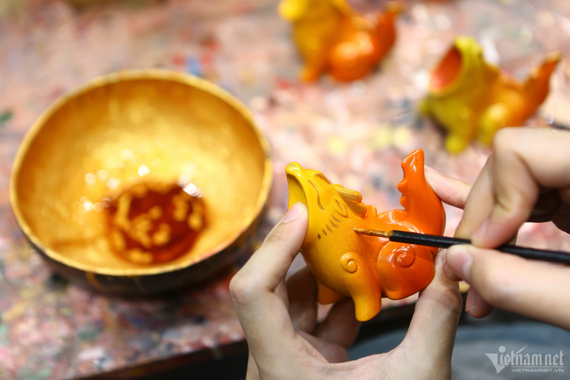 Theo bạn Thương, sinh viên Trường Đại học Mỹ thuật công nghiệp - đồng tác giả, để có sản phẩm hoàn thiện cần trải qua nhiều công đoạn, làm sơn và vẽ chi tiết, mất nhiều thời gian và công sức. "Vì làm từ bột đá ép nên khó tránh khỏi các lỗi trên bề mặt của sản phẩm, khi làm sơn mới phát hiện ra được những lỗ nhỏ, khi đó cần phải kiểm tra kỹ và sửa lại", Thương nói.