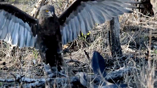 Đại bàng ẩn mình trên cây cao phát hiện con rắn hổ mang chúa đang trườn trong đám cỏ. Nó cẩn trọng chờ thời cơ để kết liễu con mồi.