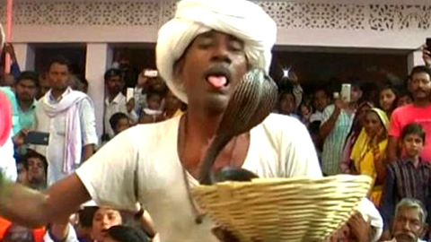 Một người đàn ông Ấn Độ đã gây kinh hãi khi cho người xem chứng kiến cảnh ông để cho rắn hổ mang chúa cắn vào lưỡi rồi truyền nọc độc sang cơ thể mình.
