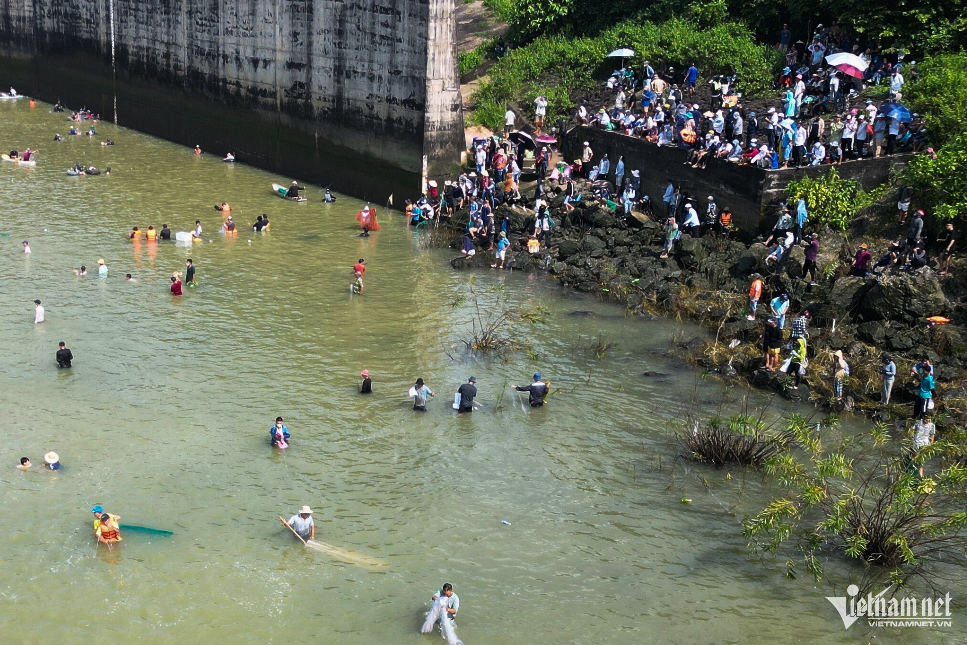 Chỉ hơn 10 phút sau khi đóng đập thủy điện, dòng người nhanh chóng chiếm trọn các bãi đá, bụi cây ven bờ. Dòng người lội xuống nước chèo thuyền, bơi lội để may mắn săn được “lộc trời”.