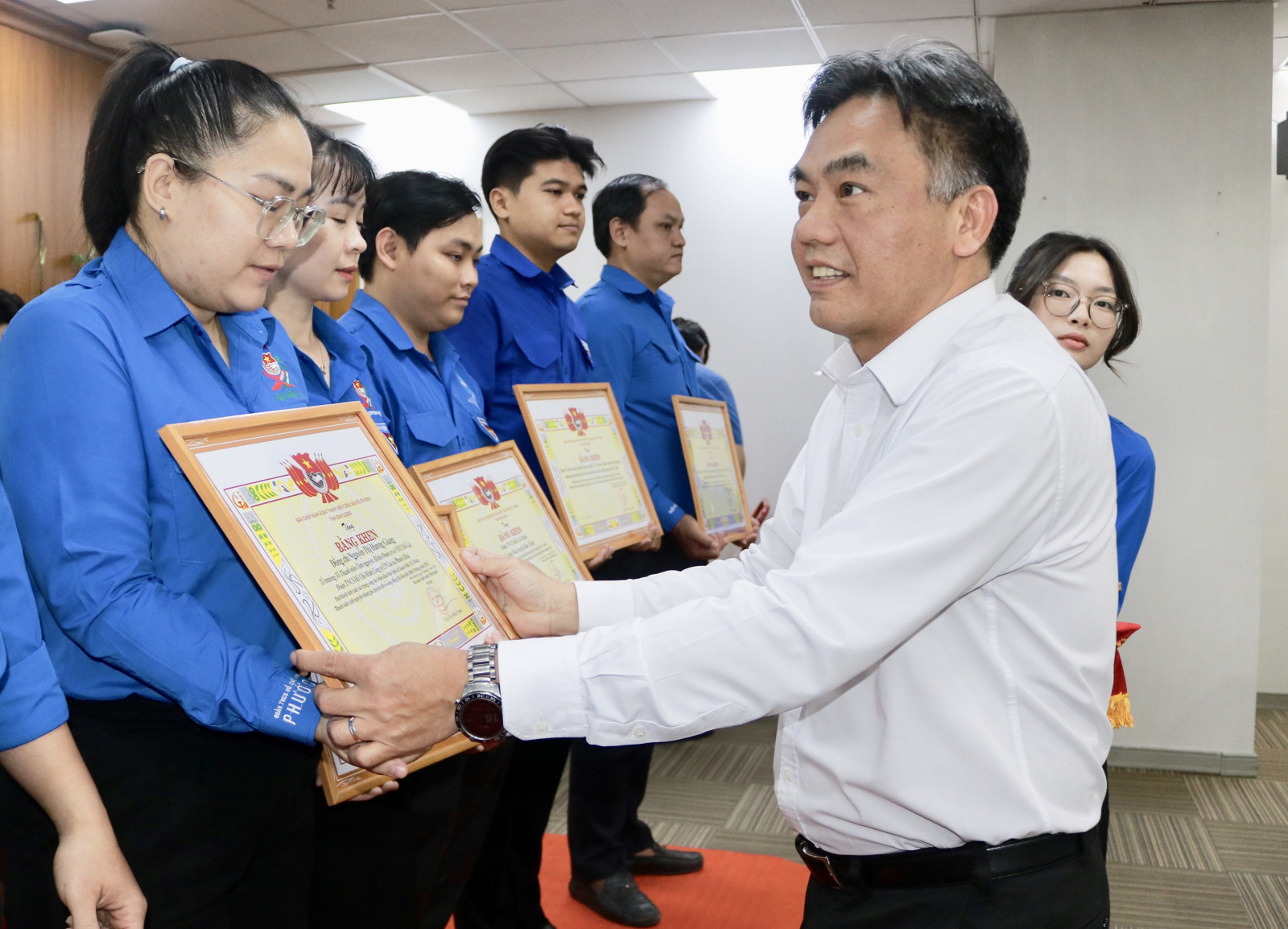 Ông Nguyễn Lộc Hà và lãnh đạo Tỉnh đoàn trao bằng khen cho các cá nhân, tập thể.