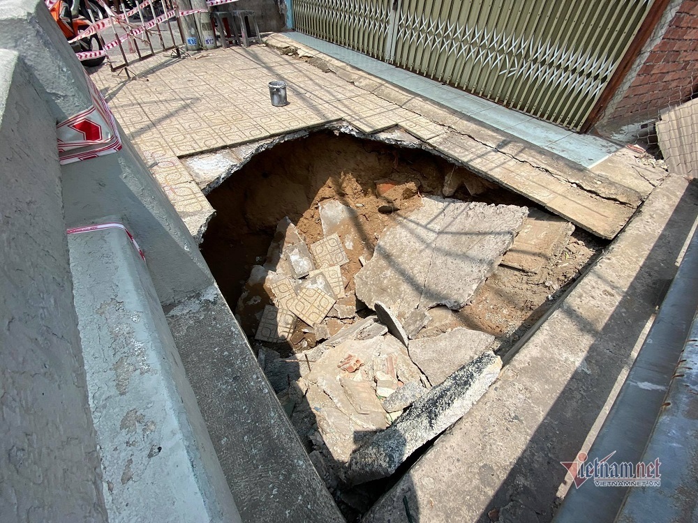Tại hiện trường, vỉa hè bị sụp lún tạo hố sâu khoảng 2m, rộng khoảng 3m, hai bên thành hố khoét hàm ếch. Căn nhà gần ‘hố tử thần’ cũng có dấu hiệu bị rạn nứt.