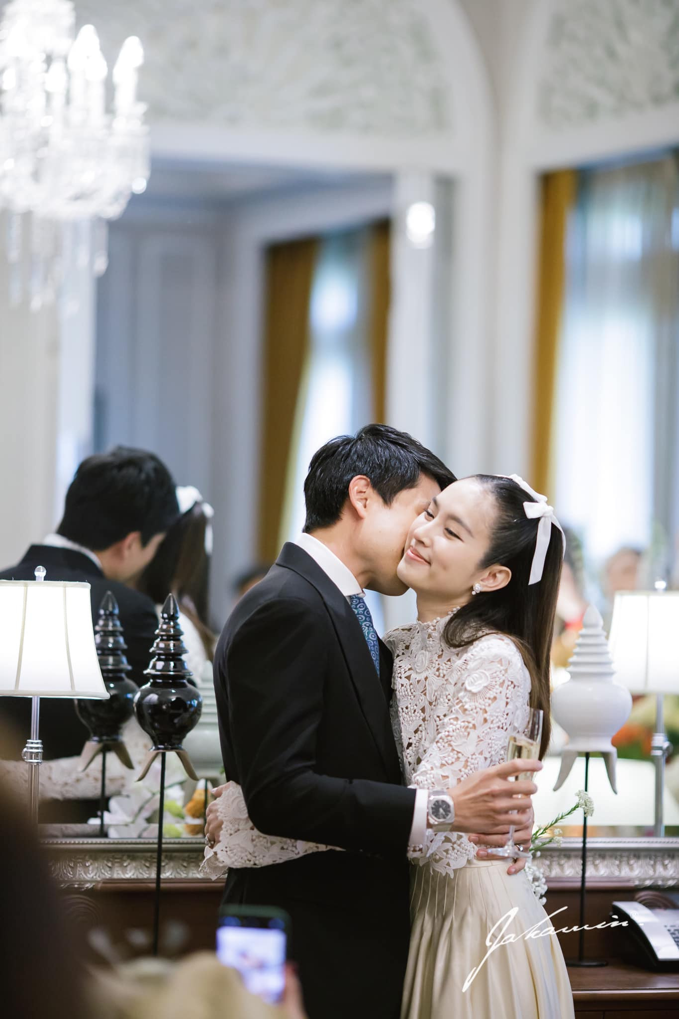 Tiệc diễn ra trong không khí thân mật, ấm cúng. Nong Poy cùng chồng sắp cưới diện trang phục phong cách hoàng gia. Trước đó, cô đã làm thủ tục đổi sang họ của doanh nhân Oak Phakwa Hongyok.