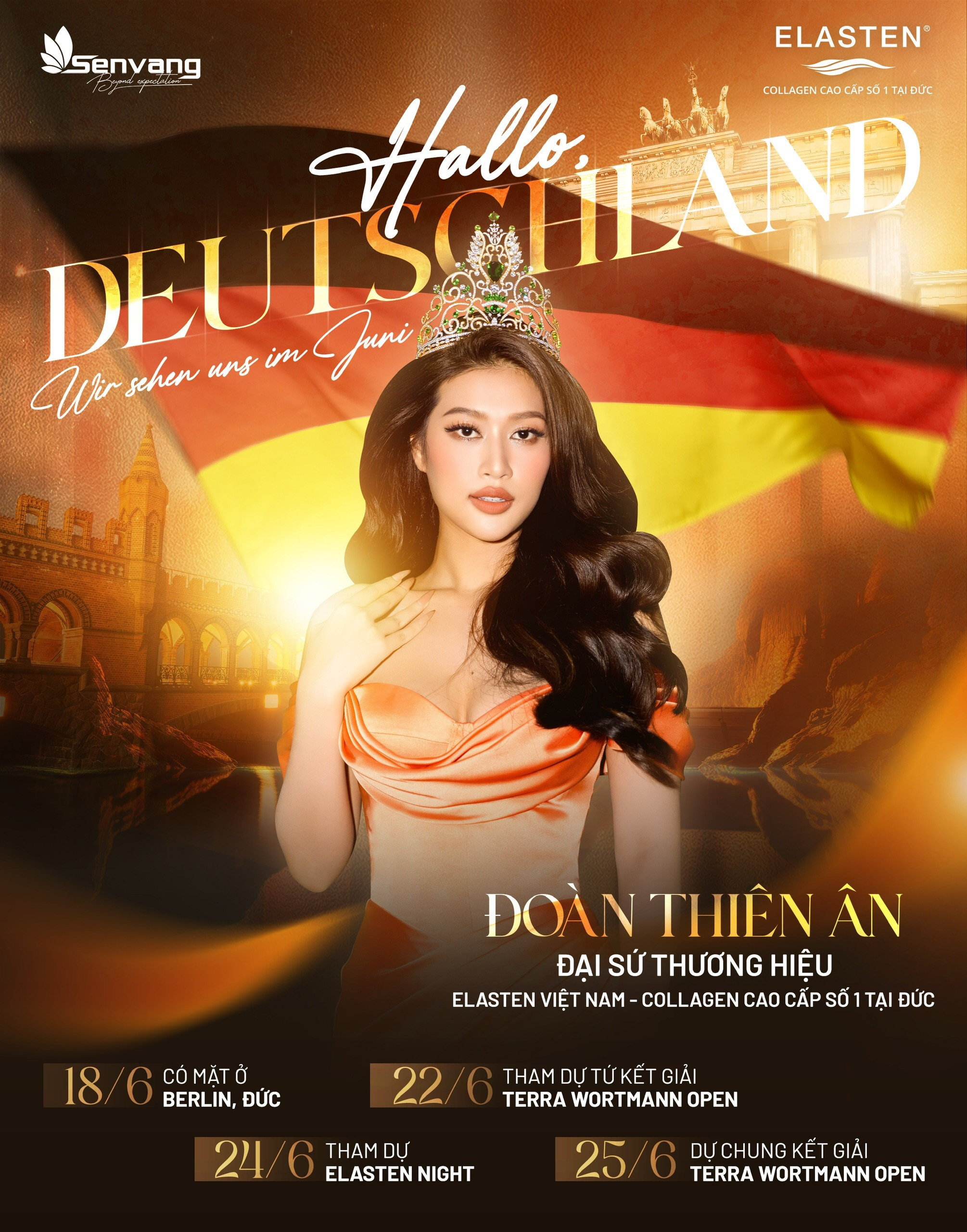 Hoa hậu Đoàn Thiên Ân vừa xác nhận trên trang cá nhân cô sẽ tham dự sự kiện giải quần vợt Terra Wortmann Open lần thứ 30 tại Đức vào tháng 6 với nhiều hoạt động thú vị. Đồng hành trong chuyến đi cùng với nàng hậu còn có bà Phạm Kim Dung - Chủ tịch Miss Grand Vietnam và đạo diễn Hoàng Nhật Nam.