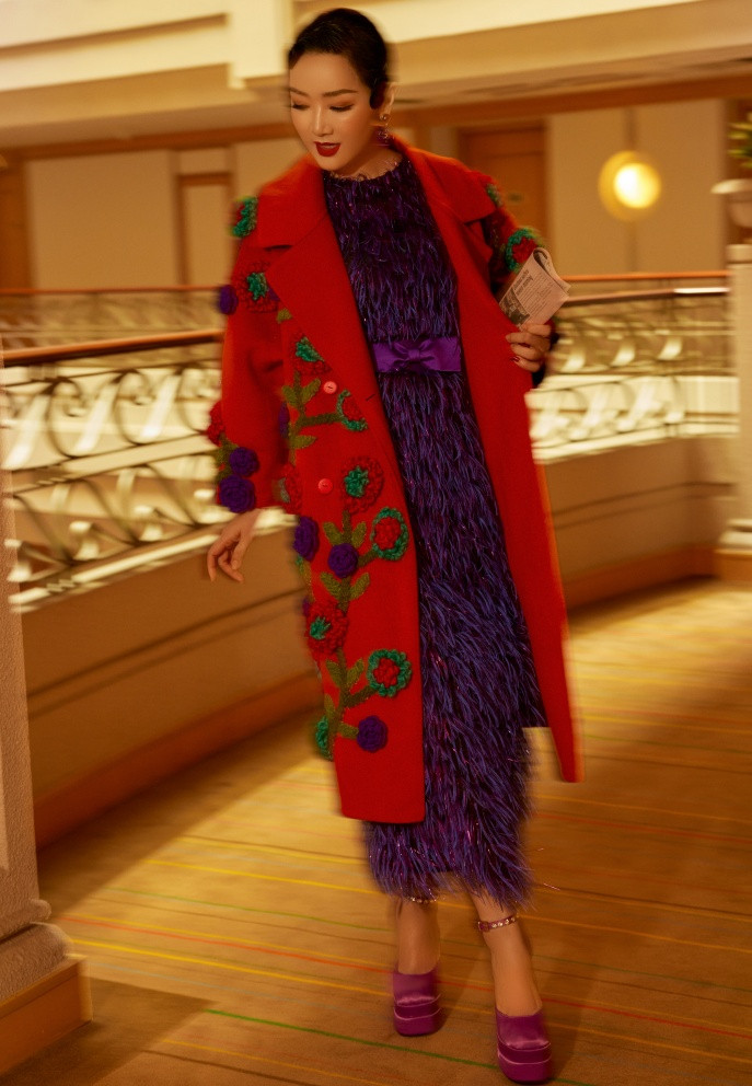 Thiết kế đầm đính lông vũ ánh kim cùng chiếc ruy băng mềm mại mặc với áo măng tô đính kết thủ công cầu kỳ là điểm nhấn cho vẻ ngoài của người mặc.