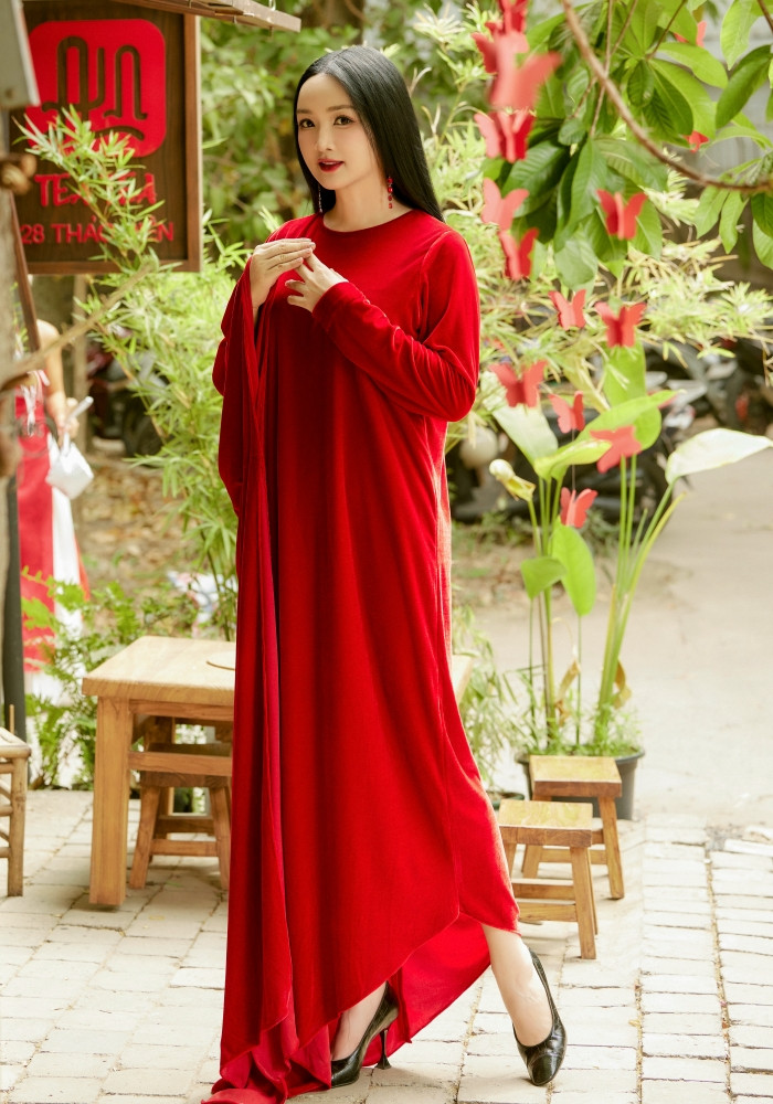 Đầm nhung đỏ kiểu dáng oversize với chi tiết cắt cúp phóng khoáng mang lại sự thanh lịch và sang trọng cho người mặc. Đây cũng là phong cách mà Vũ Ngọc và Son trung thành khi giới thiệu trong bộ sưu tập của mình.