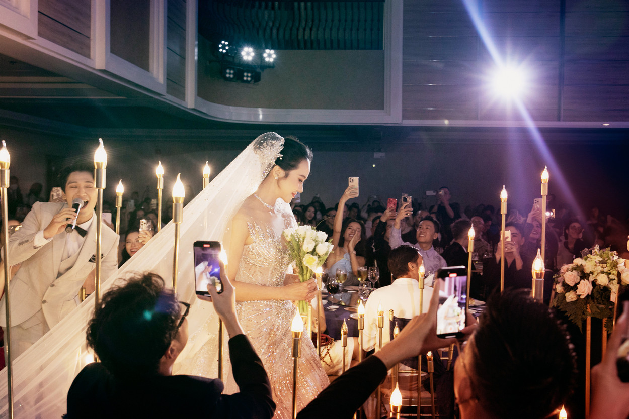 Hoa hậu Kiều Ngân xúc động bật khóc khi ông xã nắm tay bước vào lễ đường. Cô dâu xinh đẹp diện váy cưới dáng cúp ngực, đội khăn voan dài họa tiết đính đá nổi 3D.