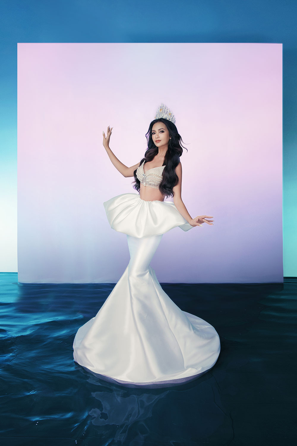 Hoa hậu Ngọc Châu vừa thực hiện bộ ảnh kỷ niệm 1 năm đăng quang Hoa hậu Hoàn vũ Việt Nam 2022. Trong loạt hình, mỹ nhân Tây Ninh diện crop top kết hợp chân váy phom dáng đuôi cá, tôn eo thon, ngực đầy cùng vóc dáng đồng hồ cát. Trang phục do Lê Ngọc Lâm thiết kế riêng cho Ngọc Châu, dựa trên định hướng từ giám đốc sáng tạo Cindy Nguyễn. NTK muốn mang đến hình ảnh mới lạ, đột phá thay cho phong cách sexy đã quen thuộc của cô.