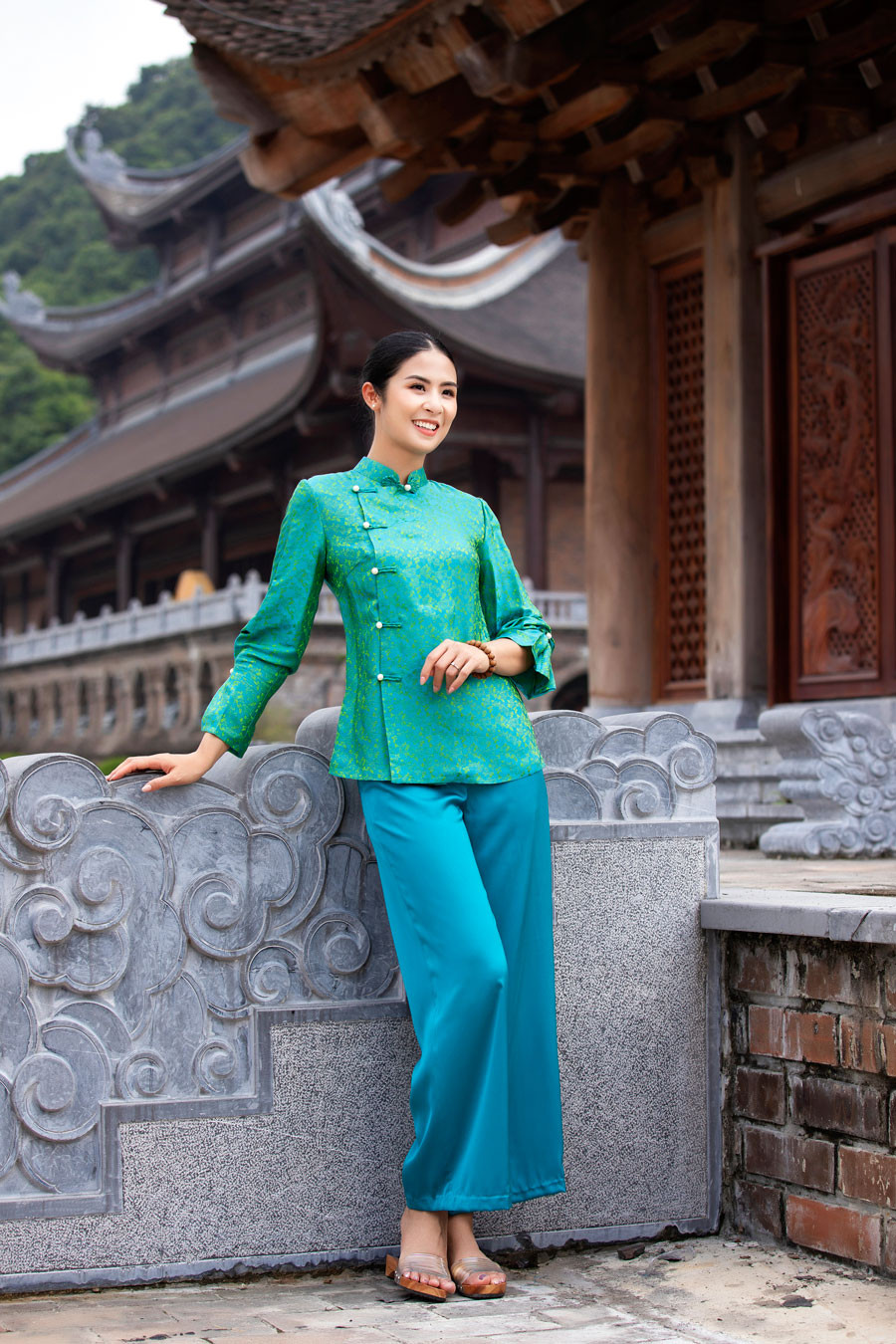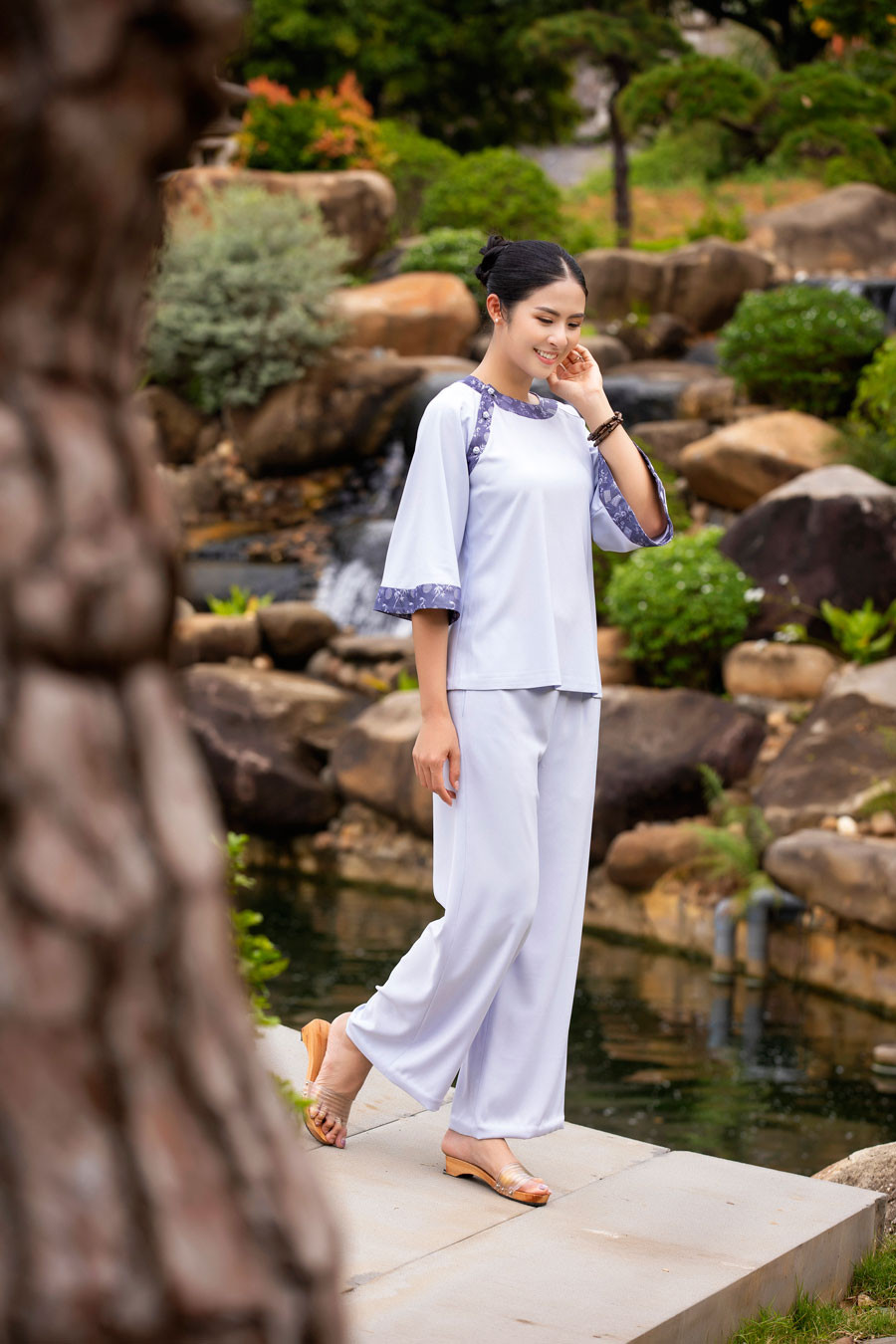 Hoa hậu Việt Nam 2010 khoe vẻ đẹp dịu dàng qua các mẫu đồ lam và áo dài. Ngọc Hân có niềm tin với Phật pháp nên cảm thấy tâm hồn thanh tịnh, an yên khi khoác lên mình những mẫu pháp phục duyên dáng trong khuôn viên ngôi chùa tĩnh mịch.