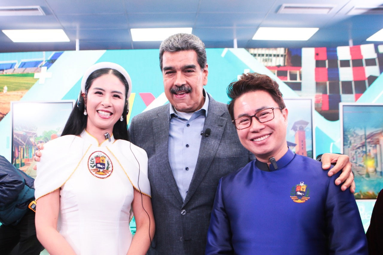 Hoa hậu Ngọc Hân và MC Trịnh Lê Anh là hai thành viên duy nhất trong đoàn Việt Nam được mời đến dinh thự của Tổng thống Venezuela Nicolás Maduro.