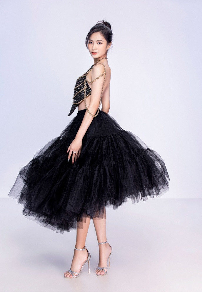 Xuất hiện trong một thiết kế khác với tông đen, Thanh Hà trở nên quyến rũ. Váy có thiết kế để lộ tấm lưng trần gợi cảm giúp hoa hậu 18 tuổi khoe trọn thân hình cân đối và gương mặt sắc sảo.